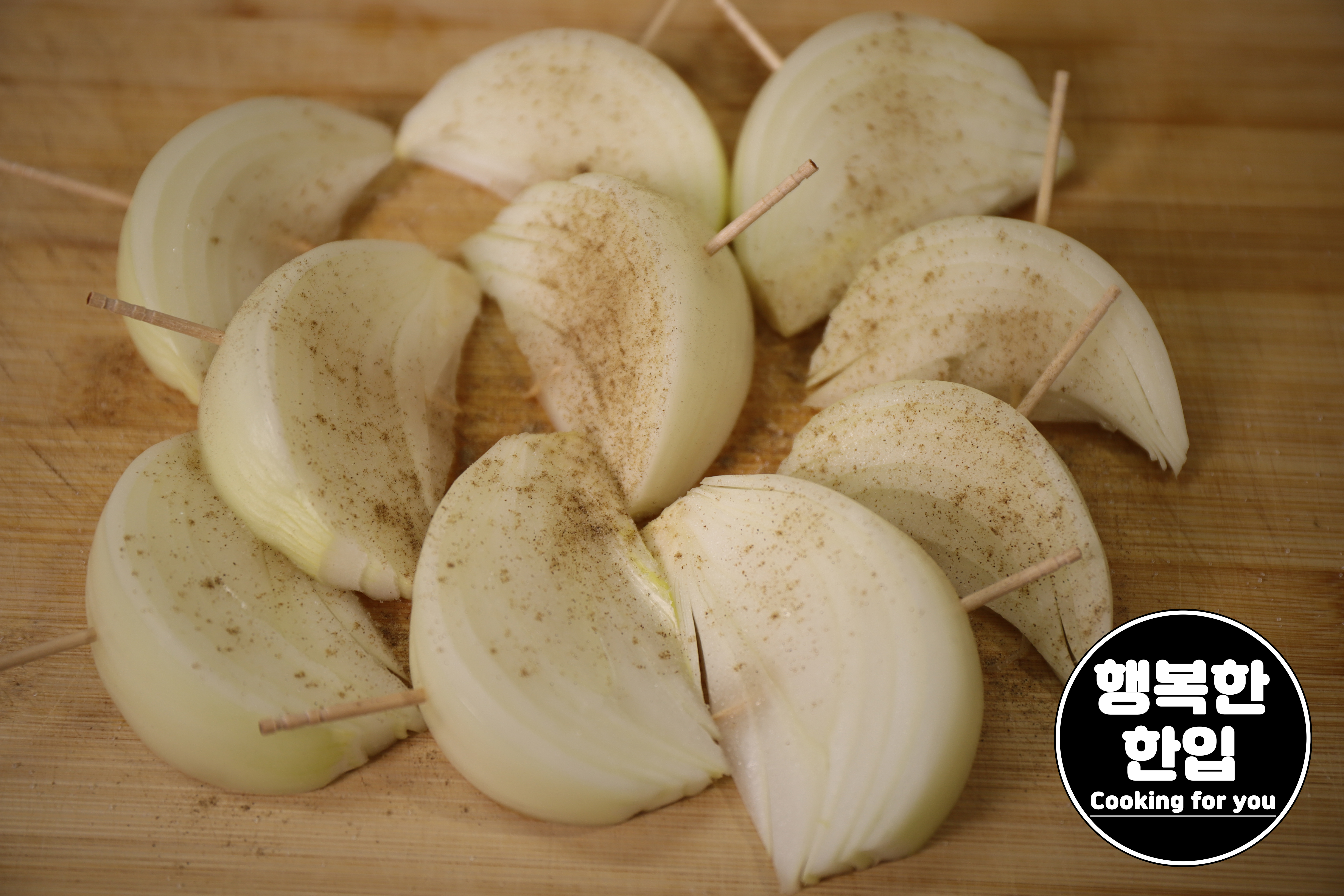 이렇게 하면 양파가 떨어지지 않아 굽기도 수월하고 먹을때도 편리합니다.