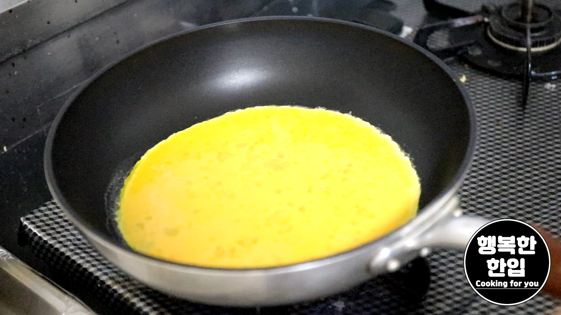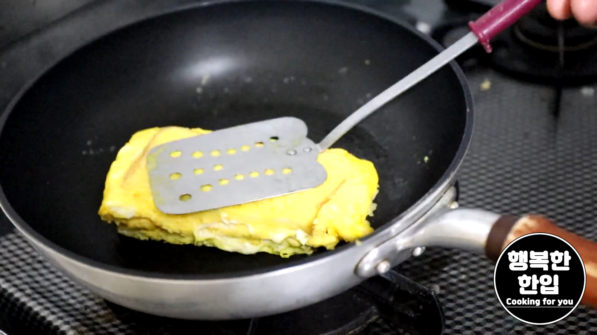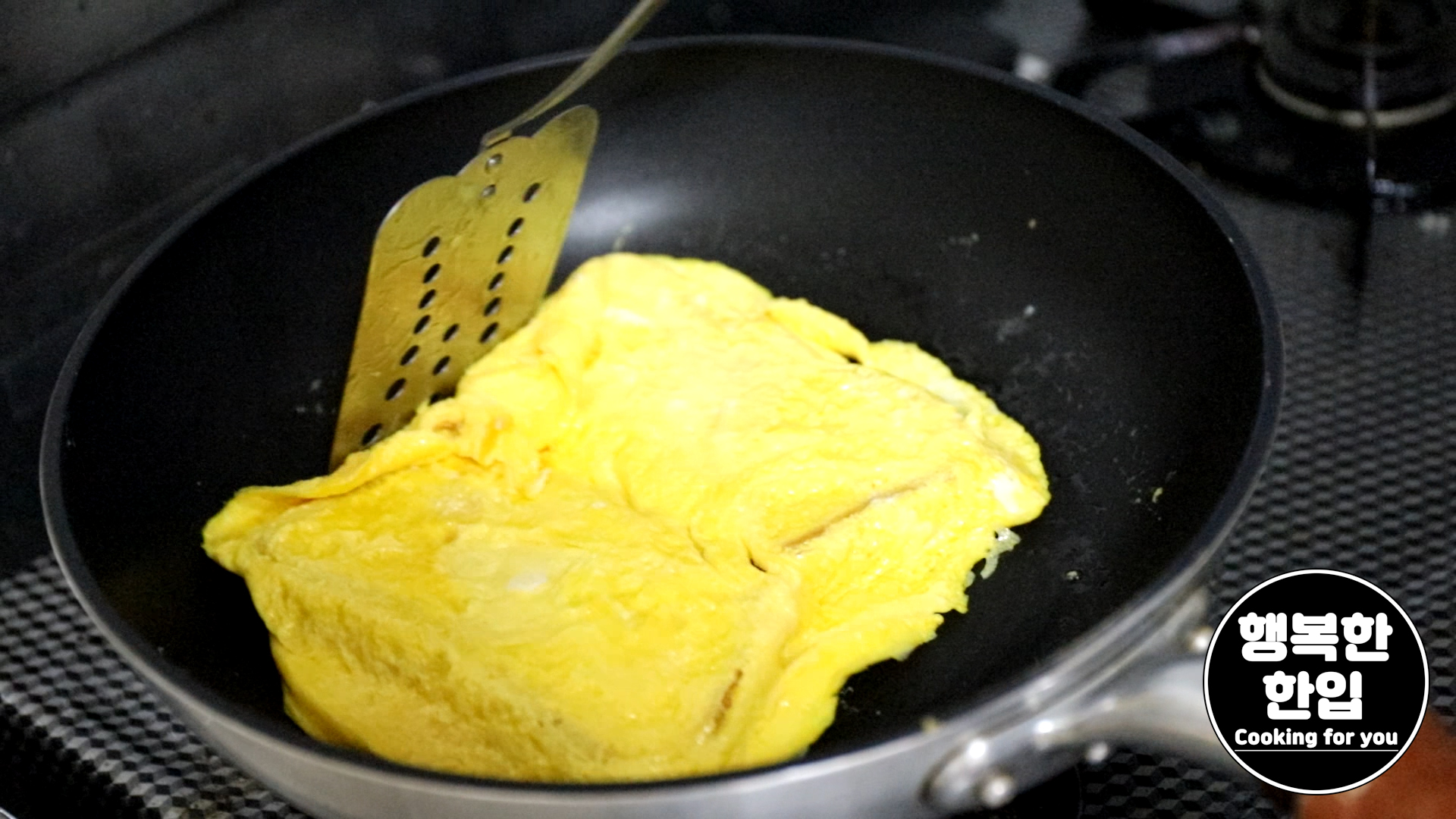뒤집개를 이용해서 계란을 천천히 긁어가며 반대편으로 잘 뒤집어주세요.