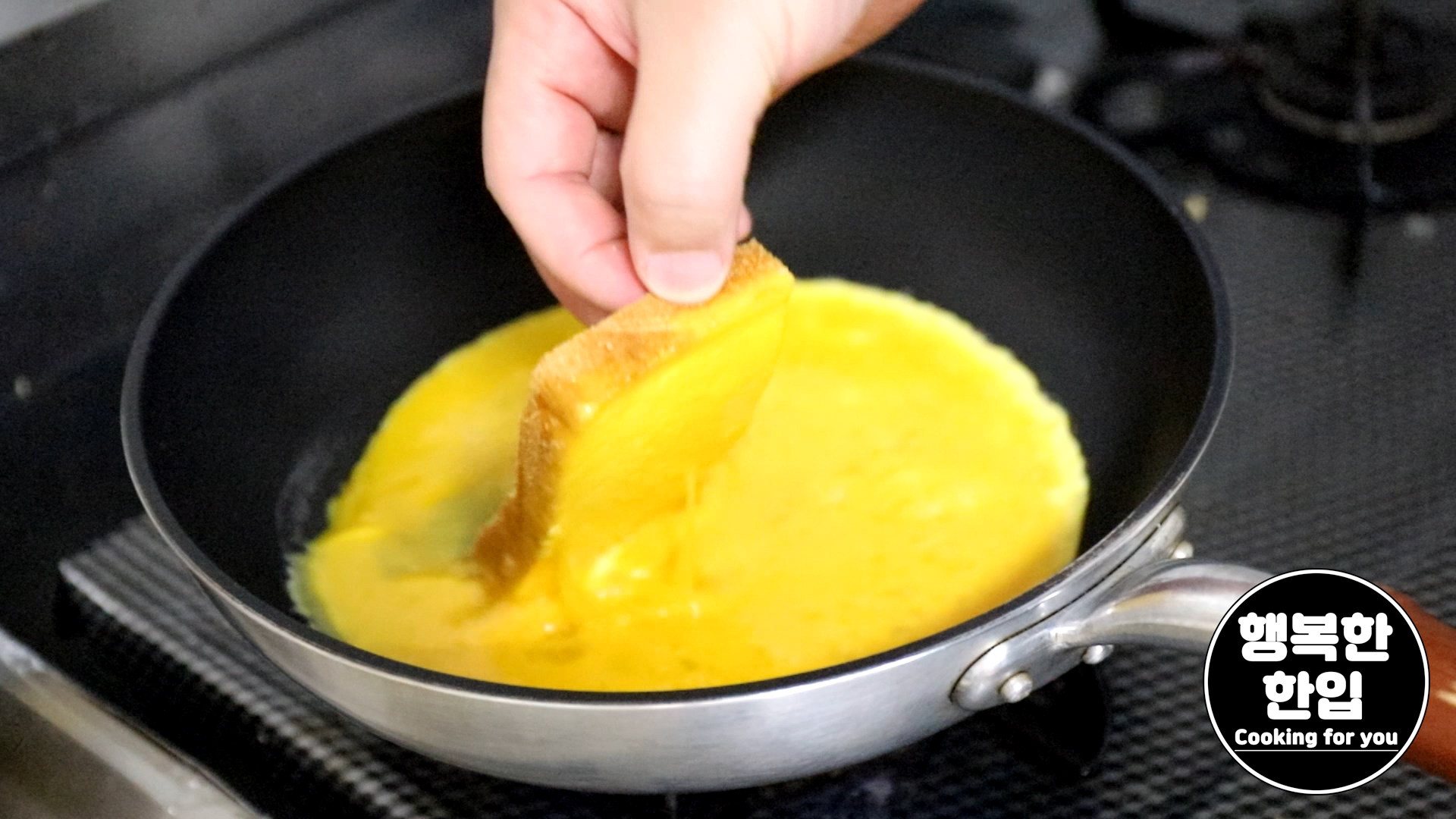 식빵은 한쪽면을 계란에 묻힌 후 뒤집어주세요.