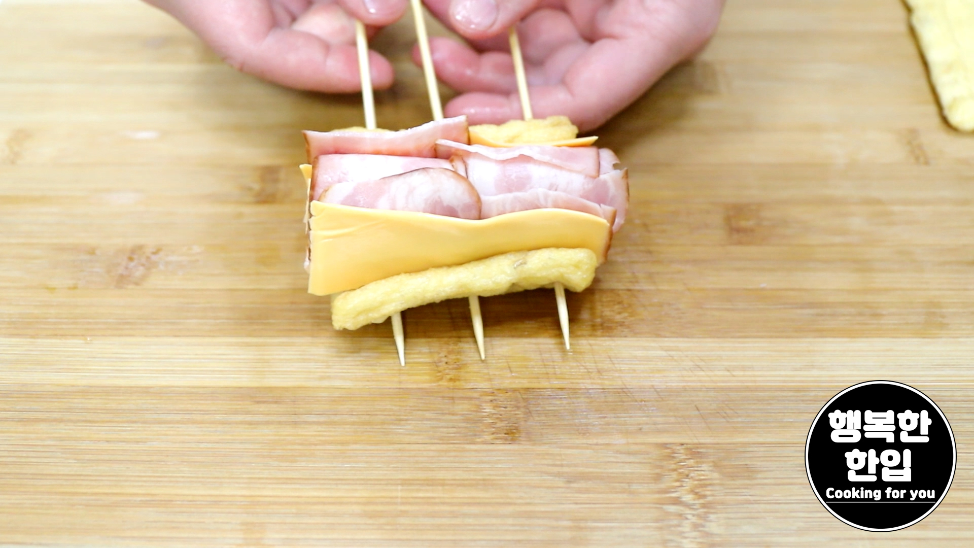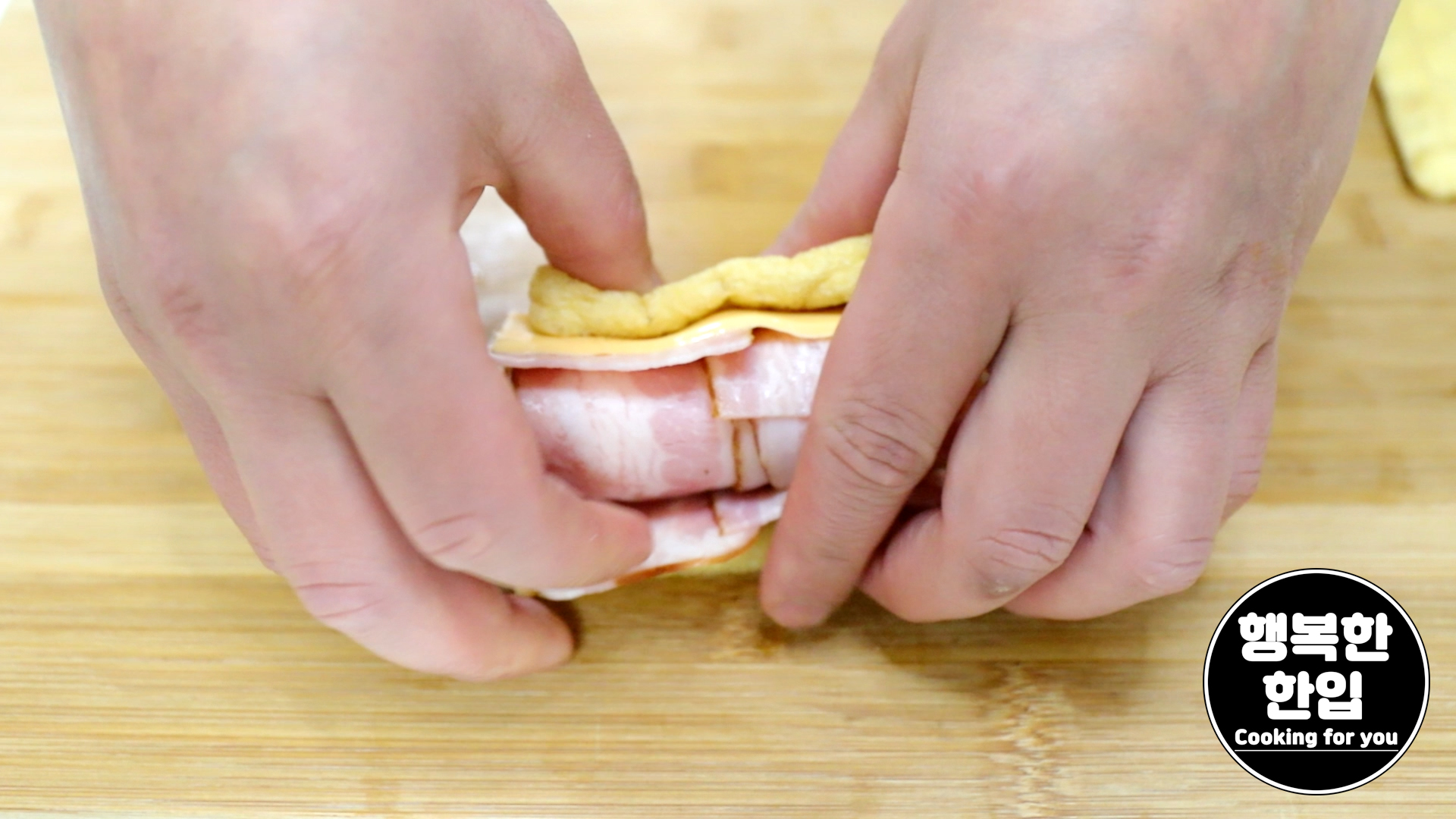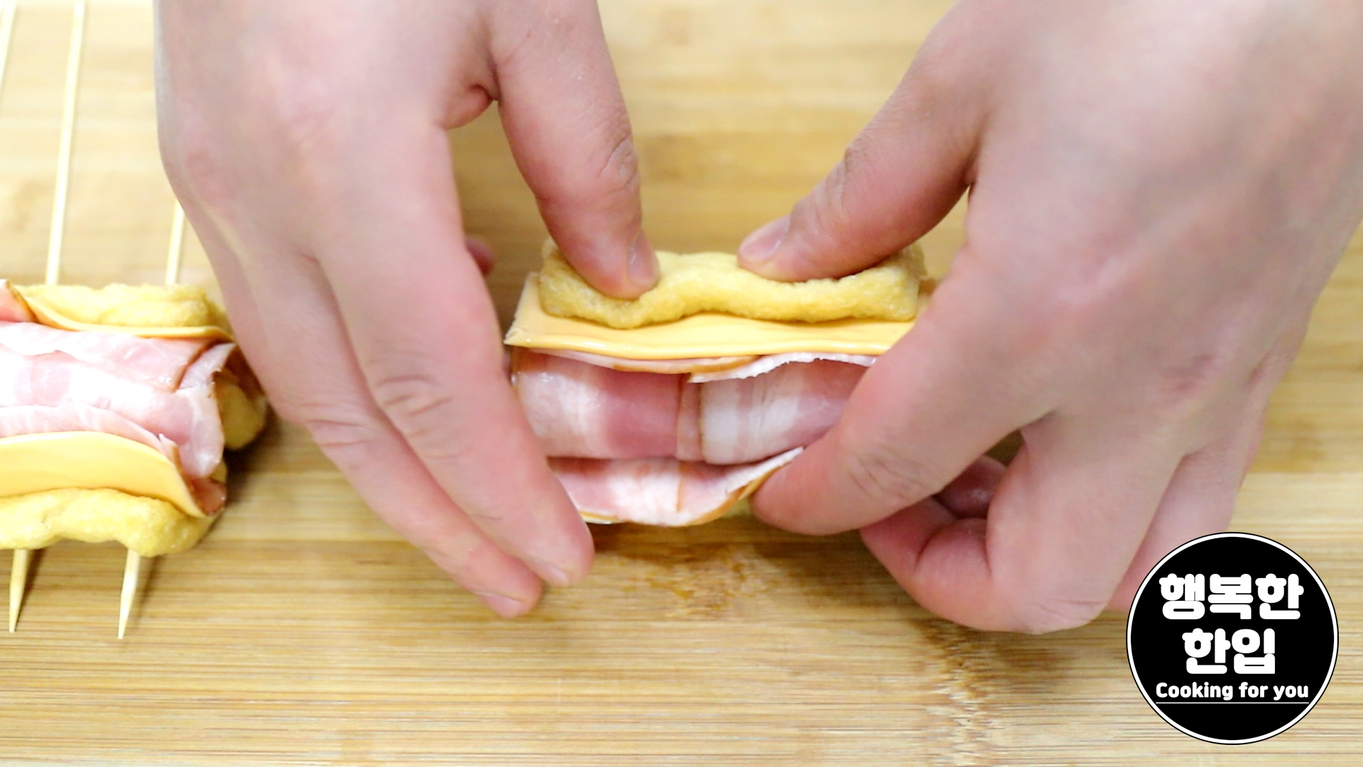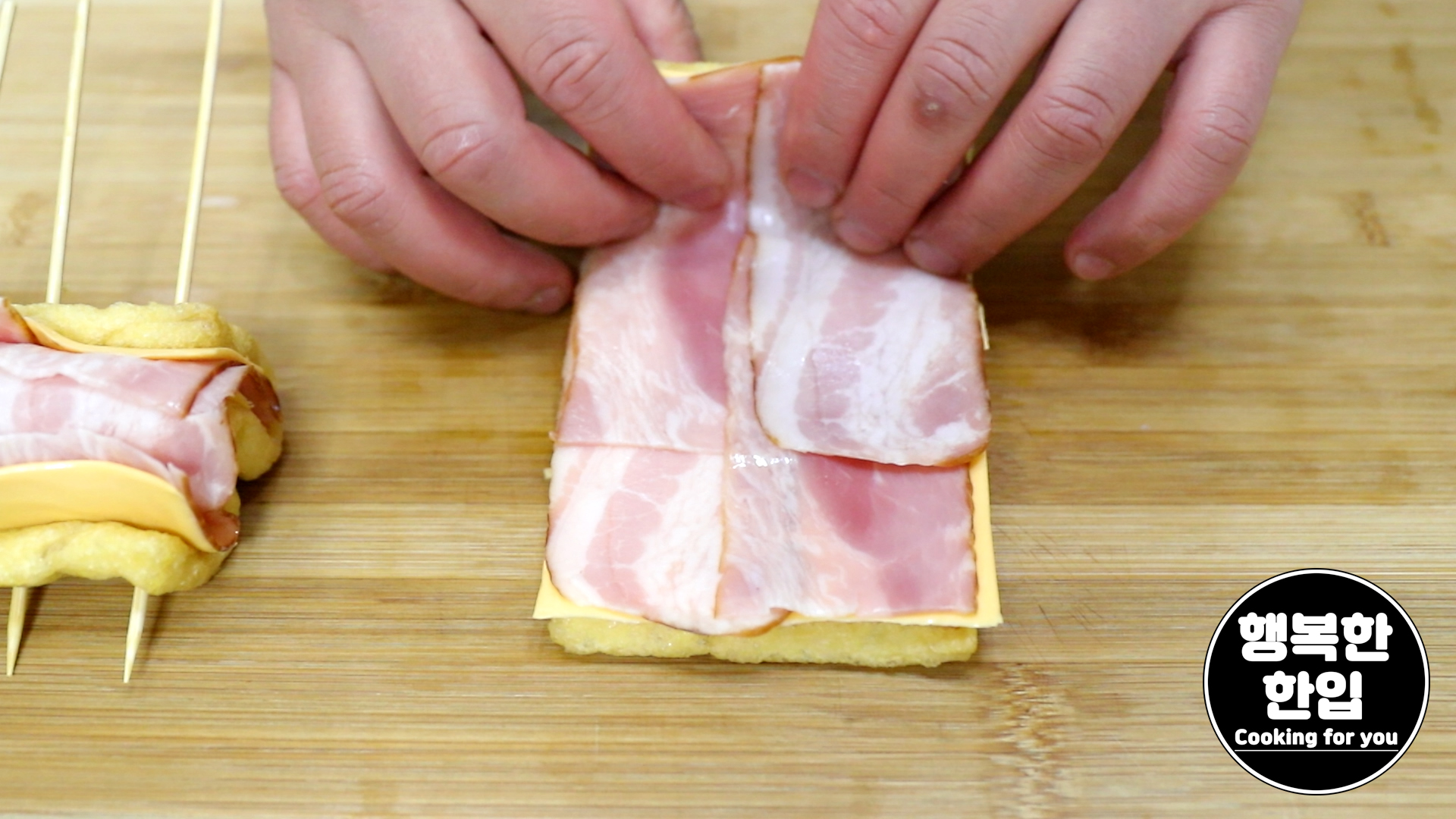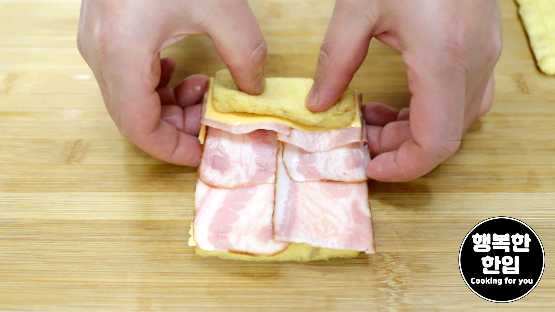 유부와 베이컨, 치즈를 지그재그로 접어주세요.