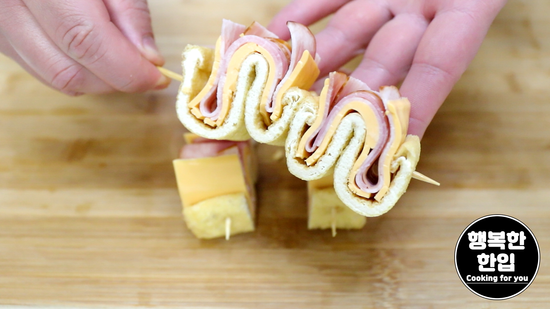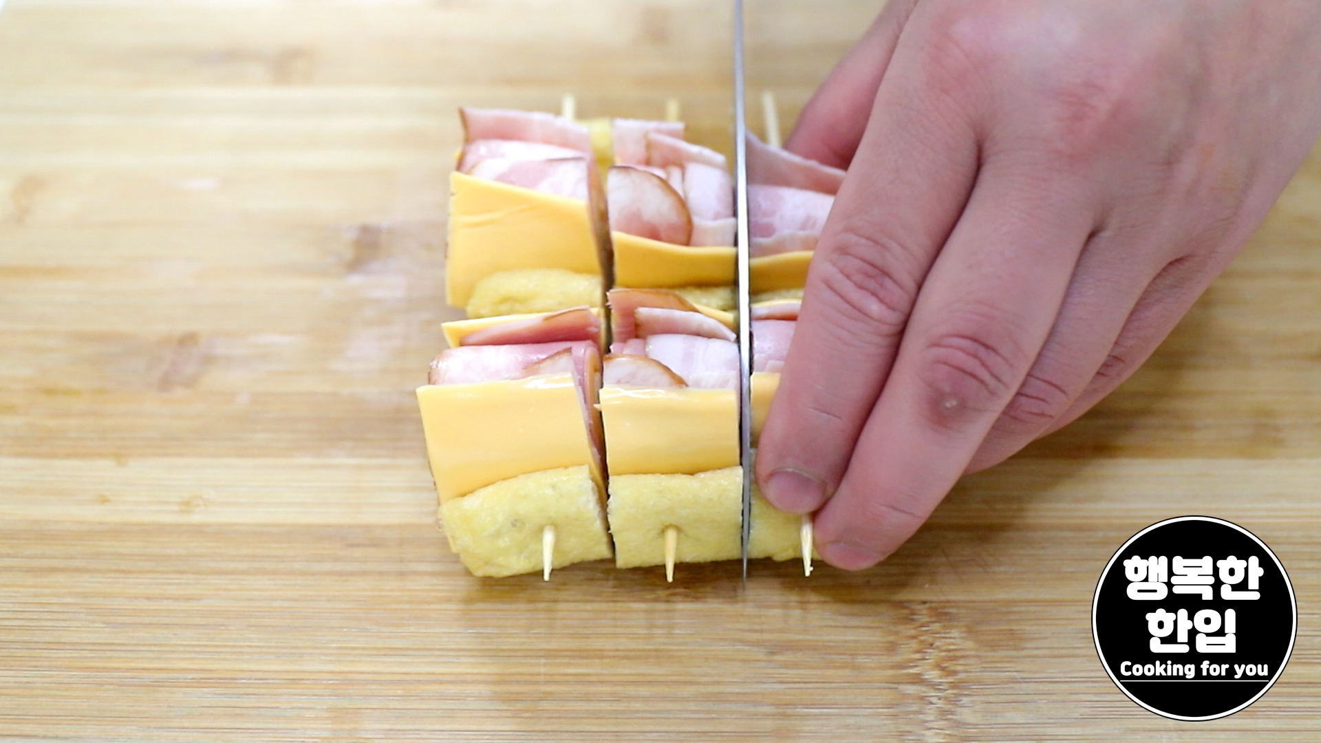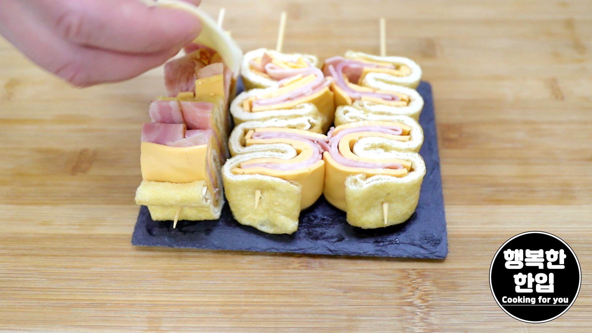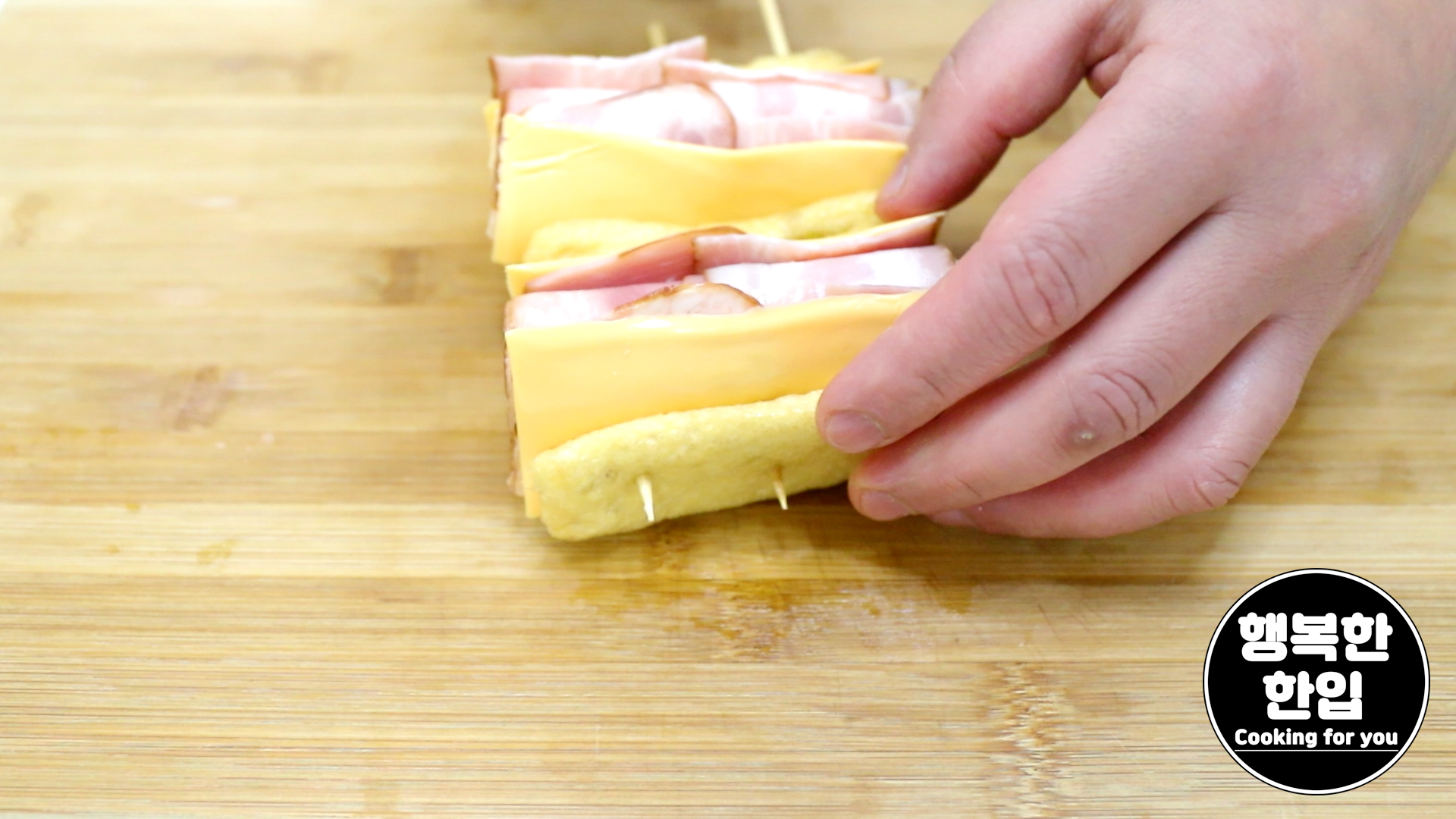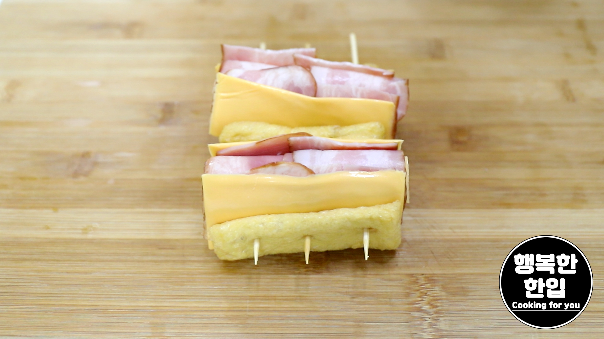 유부와 베이컨, 치즈를 지그재그로 접어주세요.