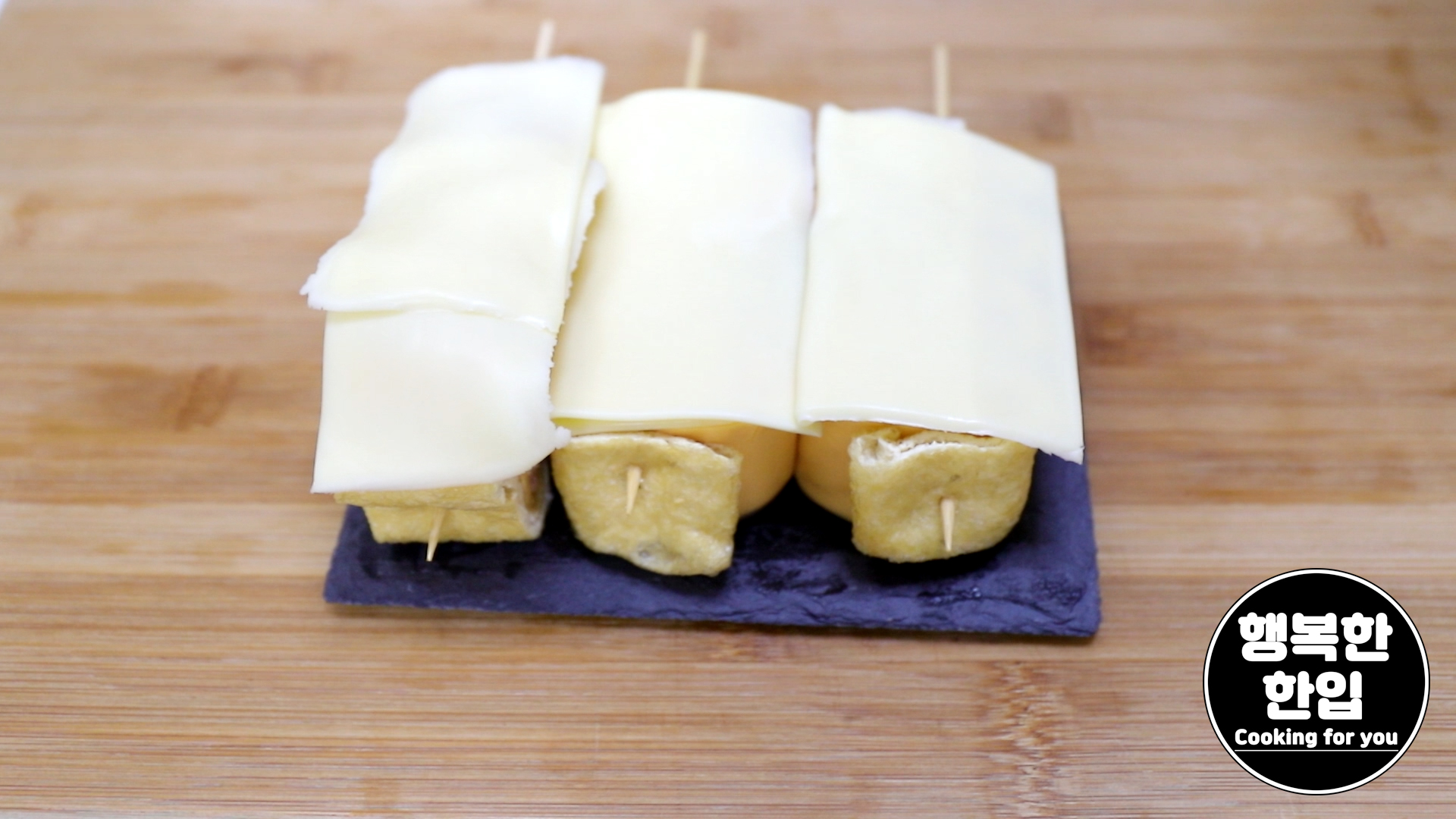 모짜렐라치즈를 알맞은 크기로 잘라서 유부 위에 얹어주세요.