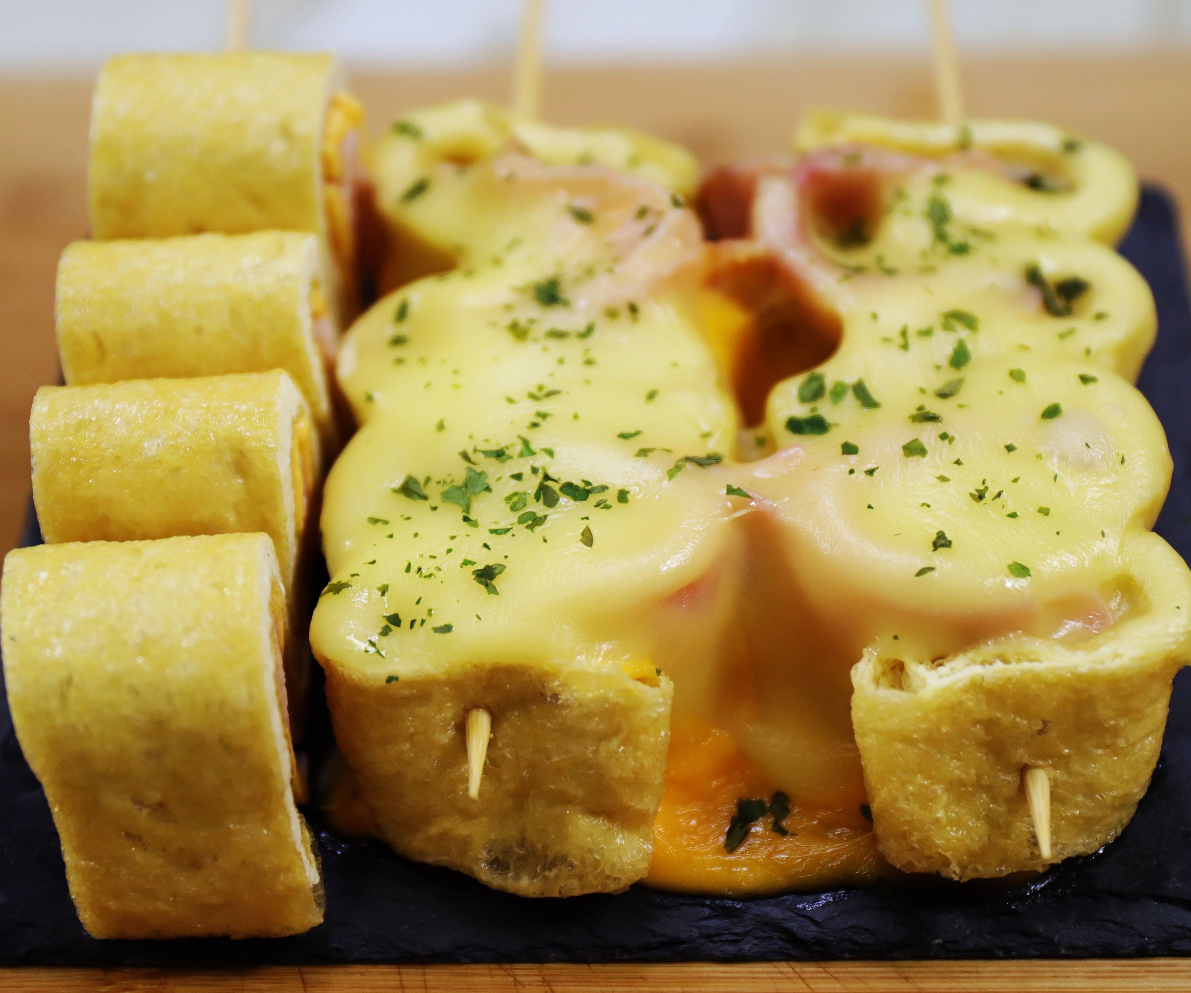 유부와 베이컨, 치즈를 지그재그로 접어주세요.