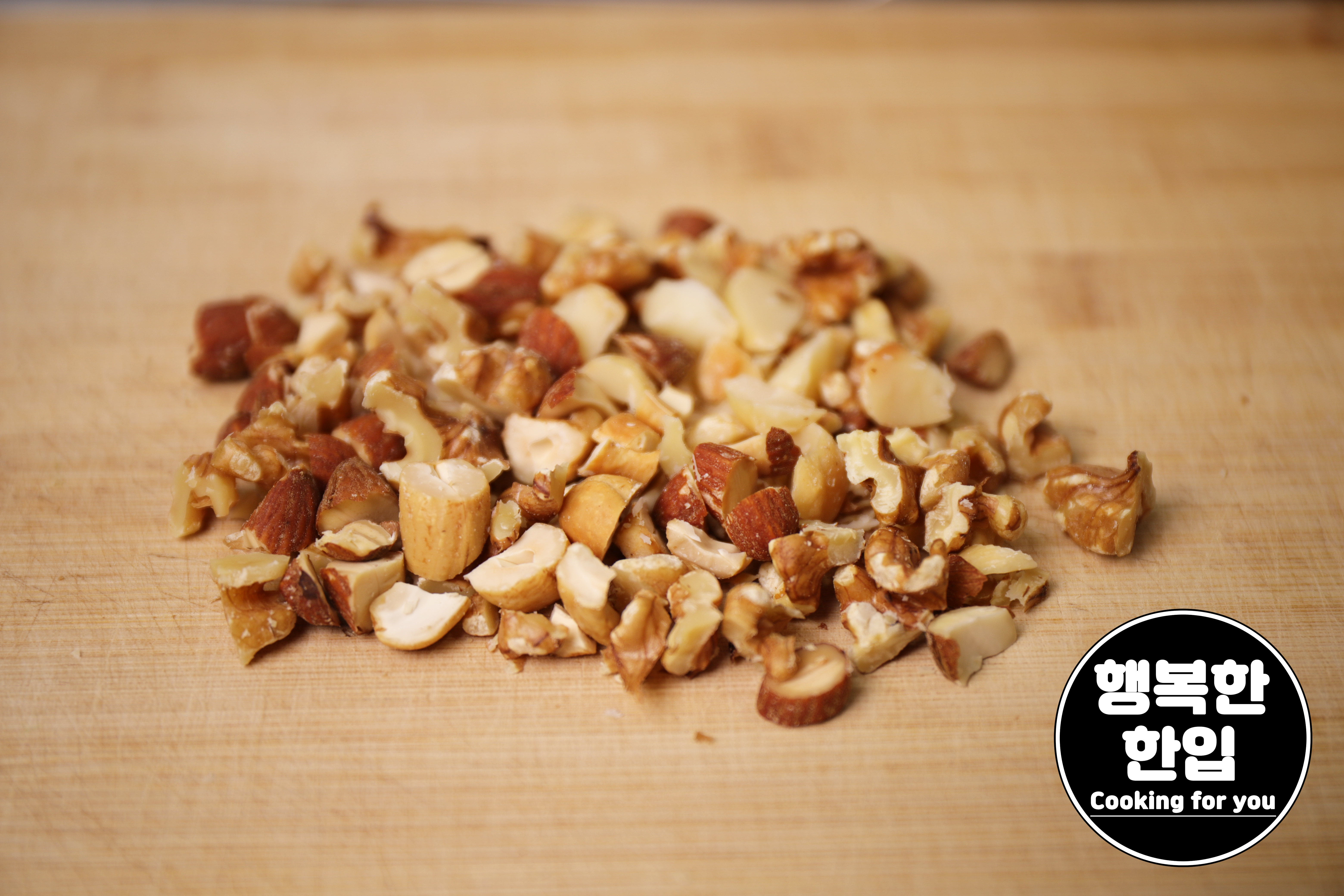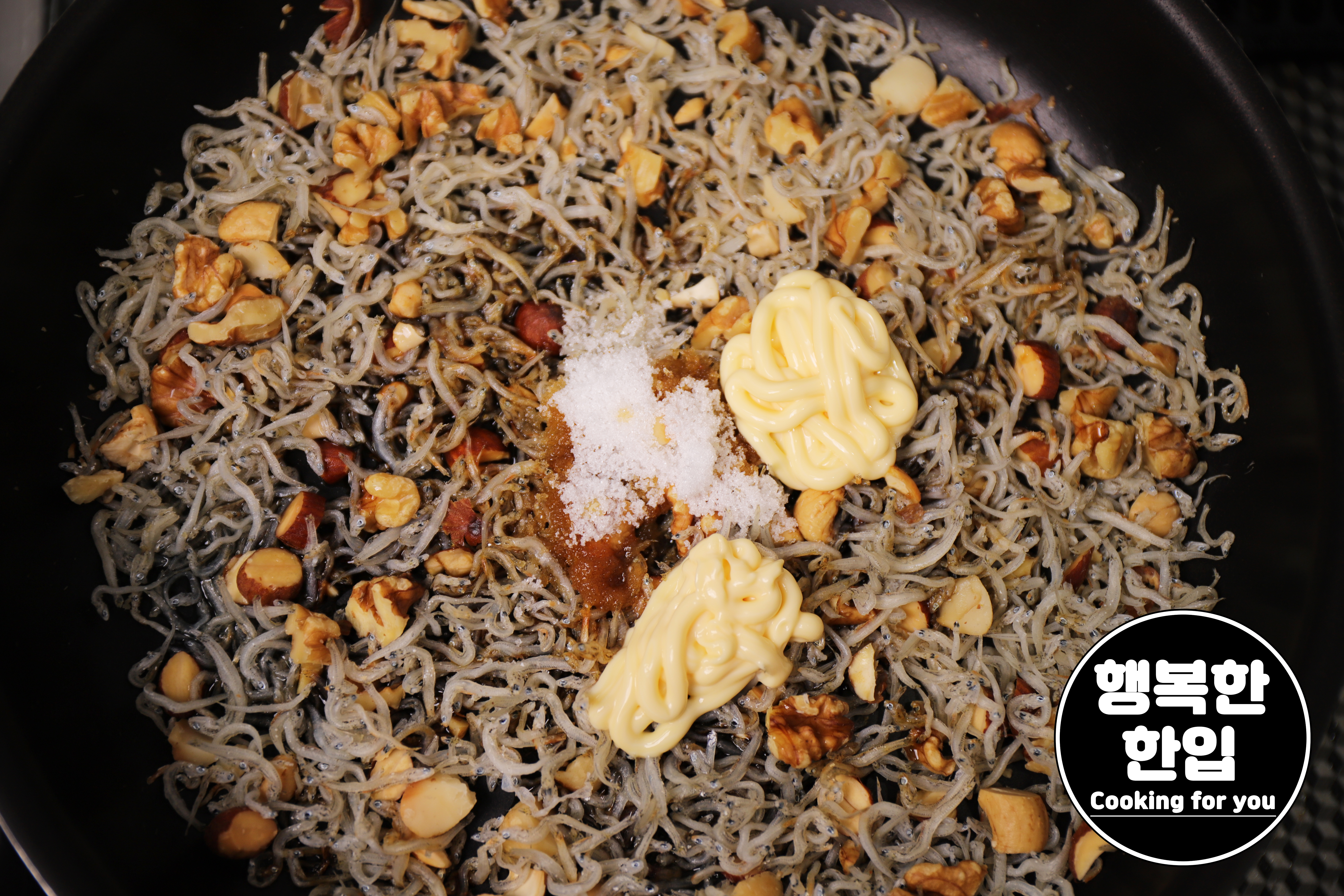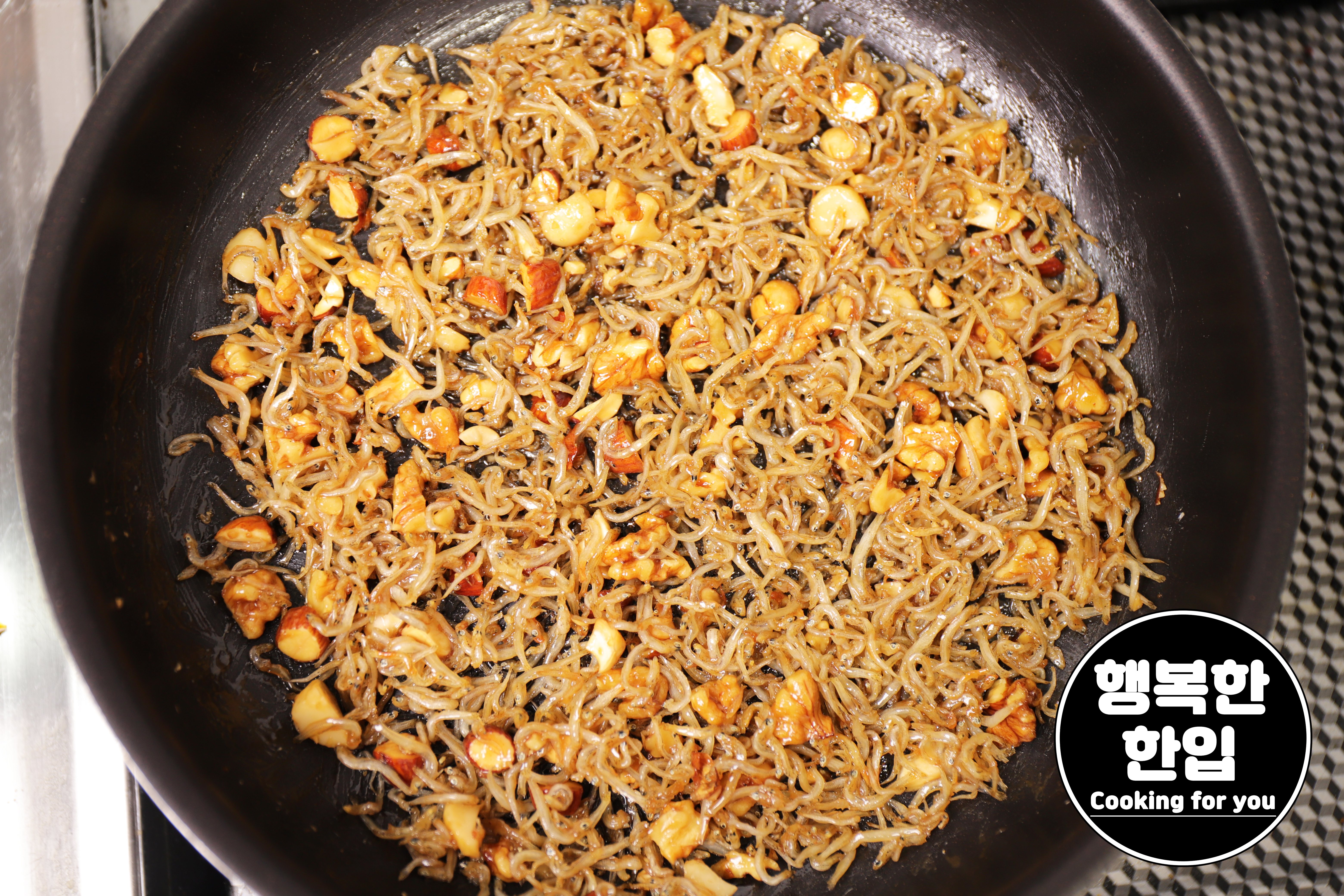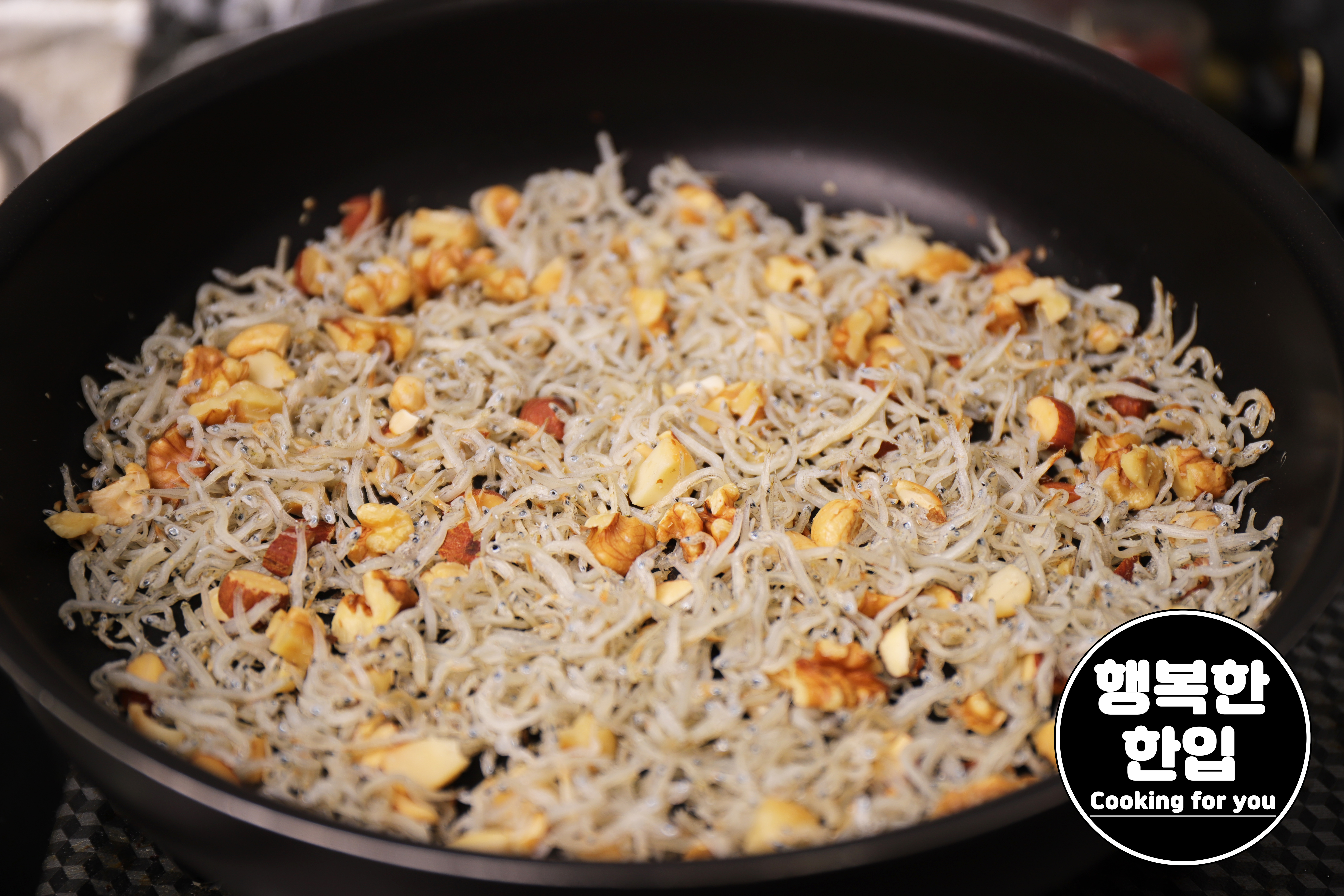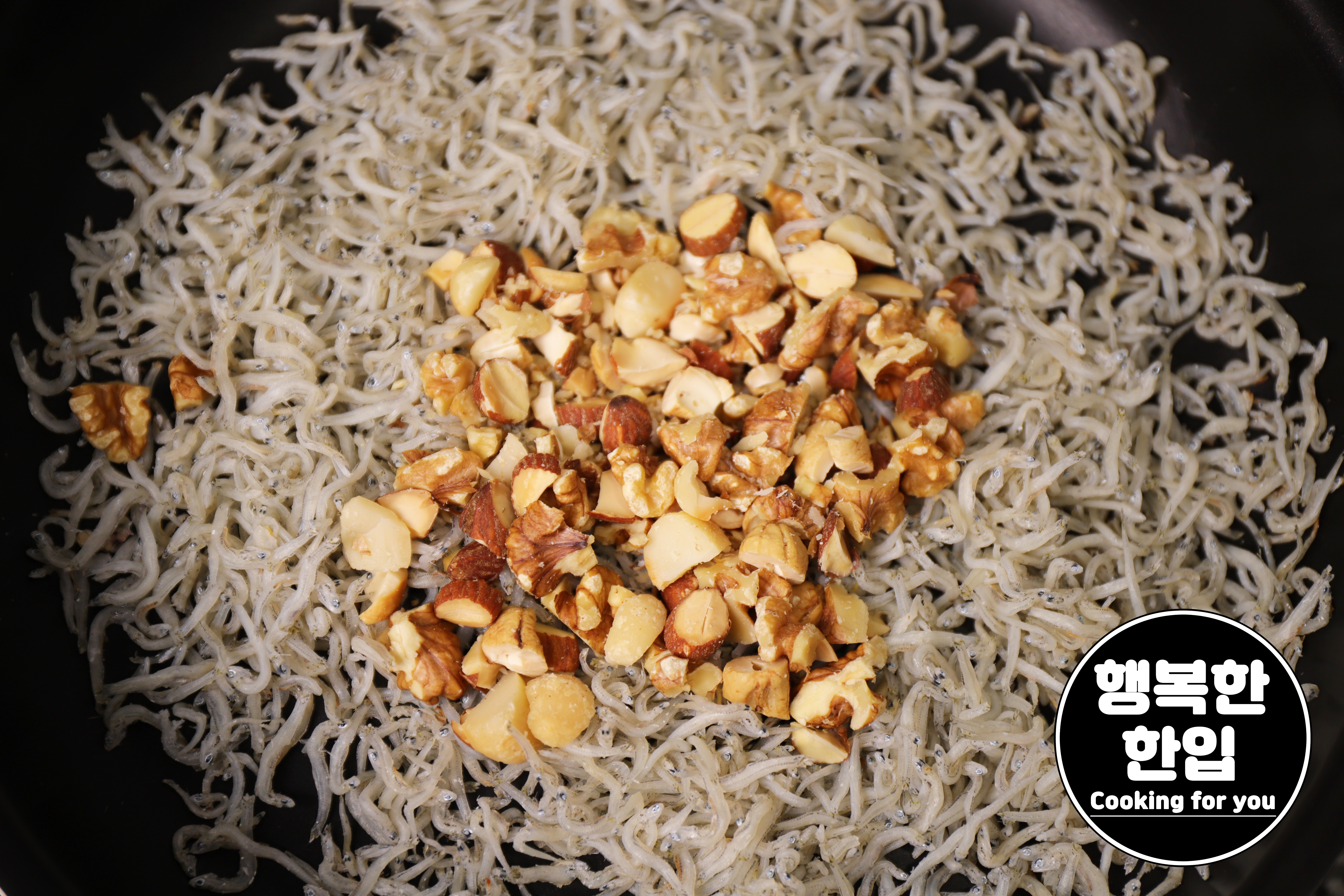 잔멸치의 수분이 어느정도 날아가면 알맞은 크기로 잘라준 견과류도 함께 볶아주세요.