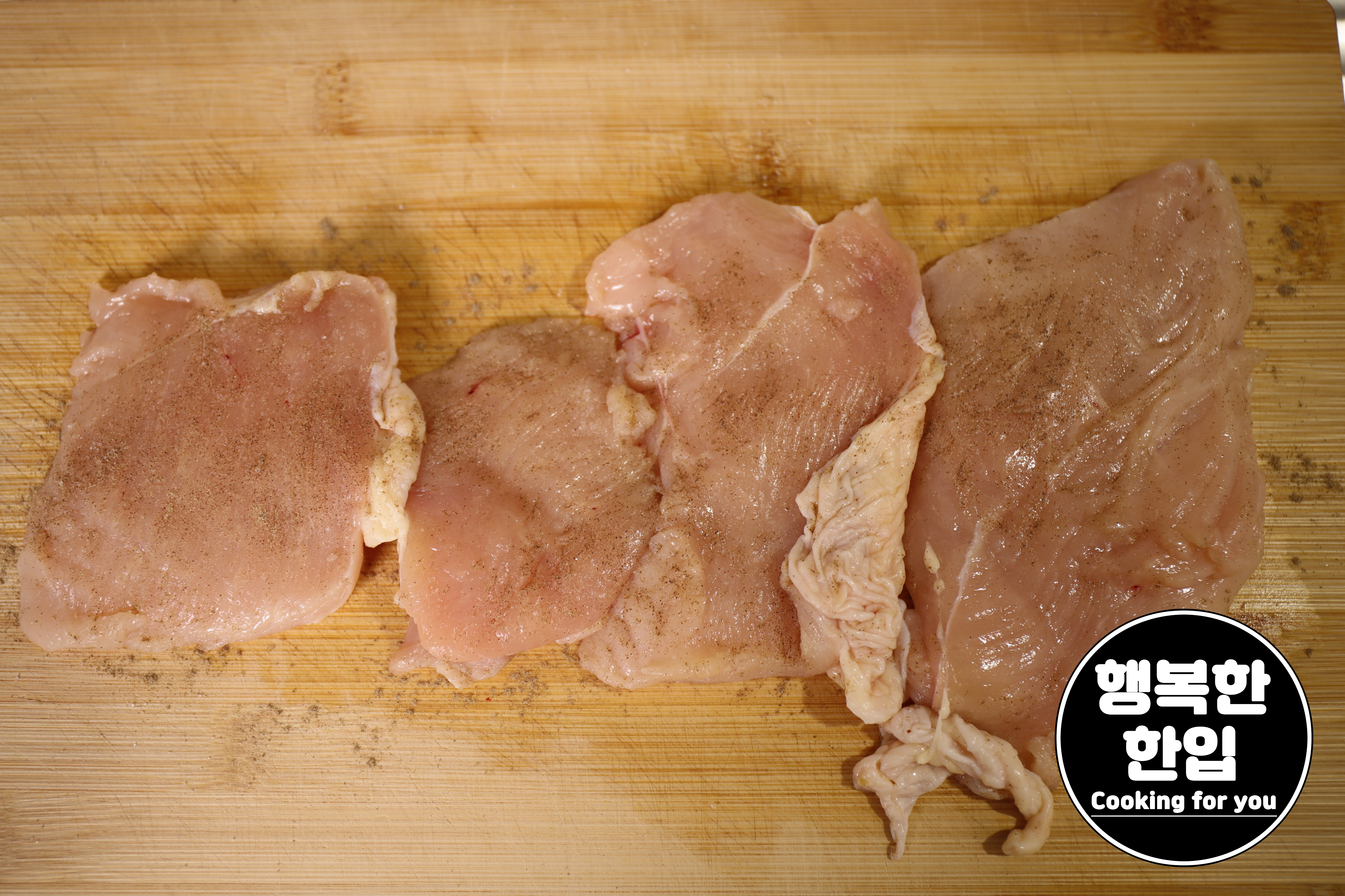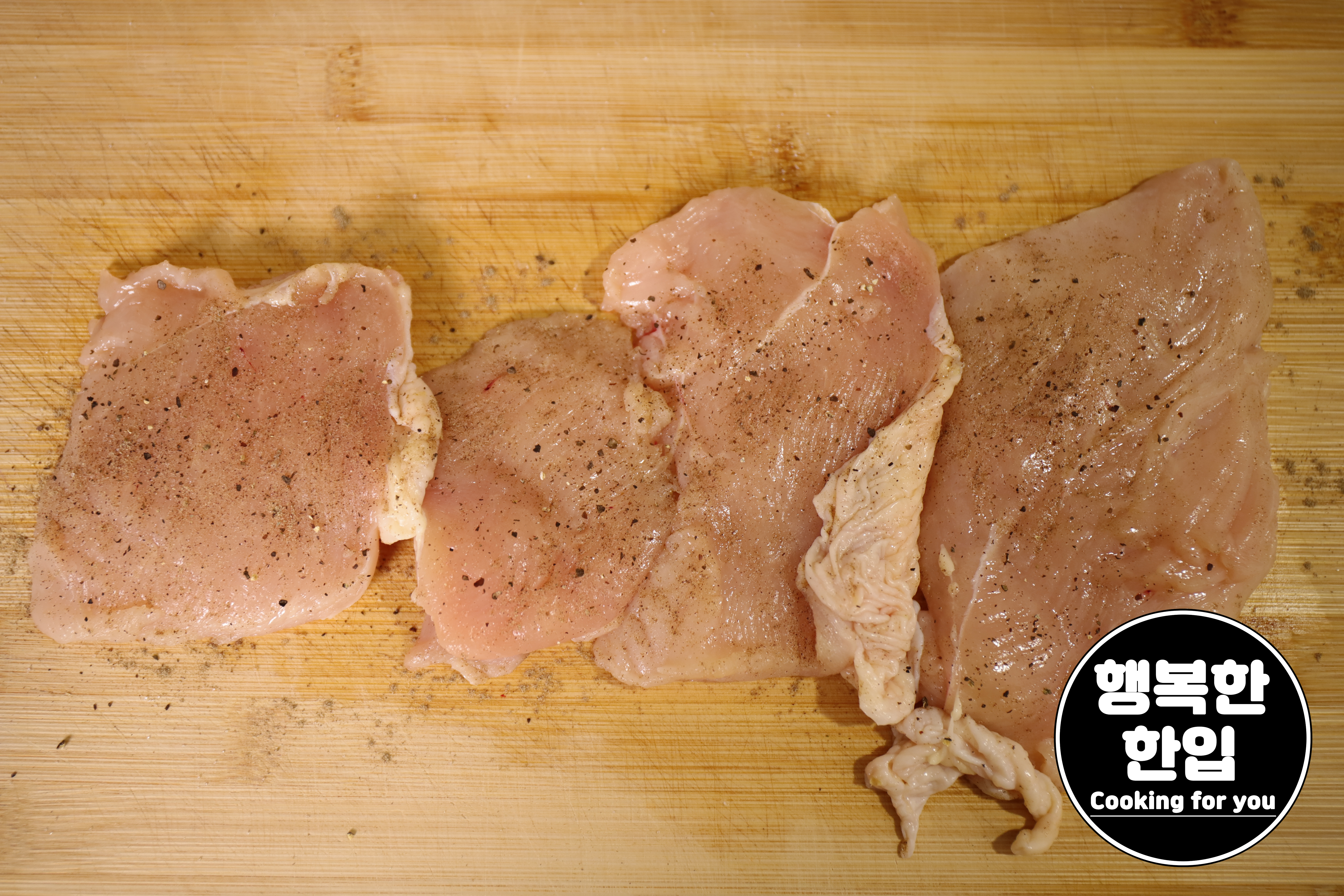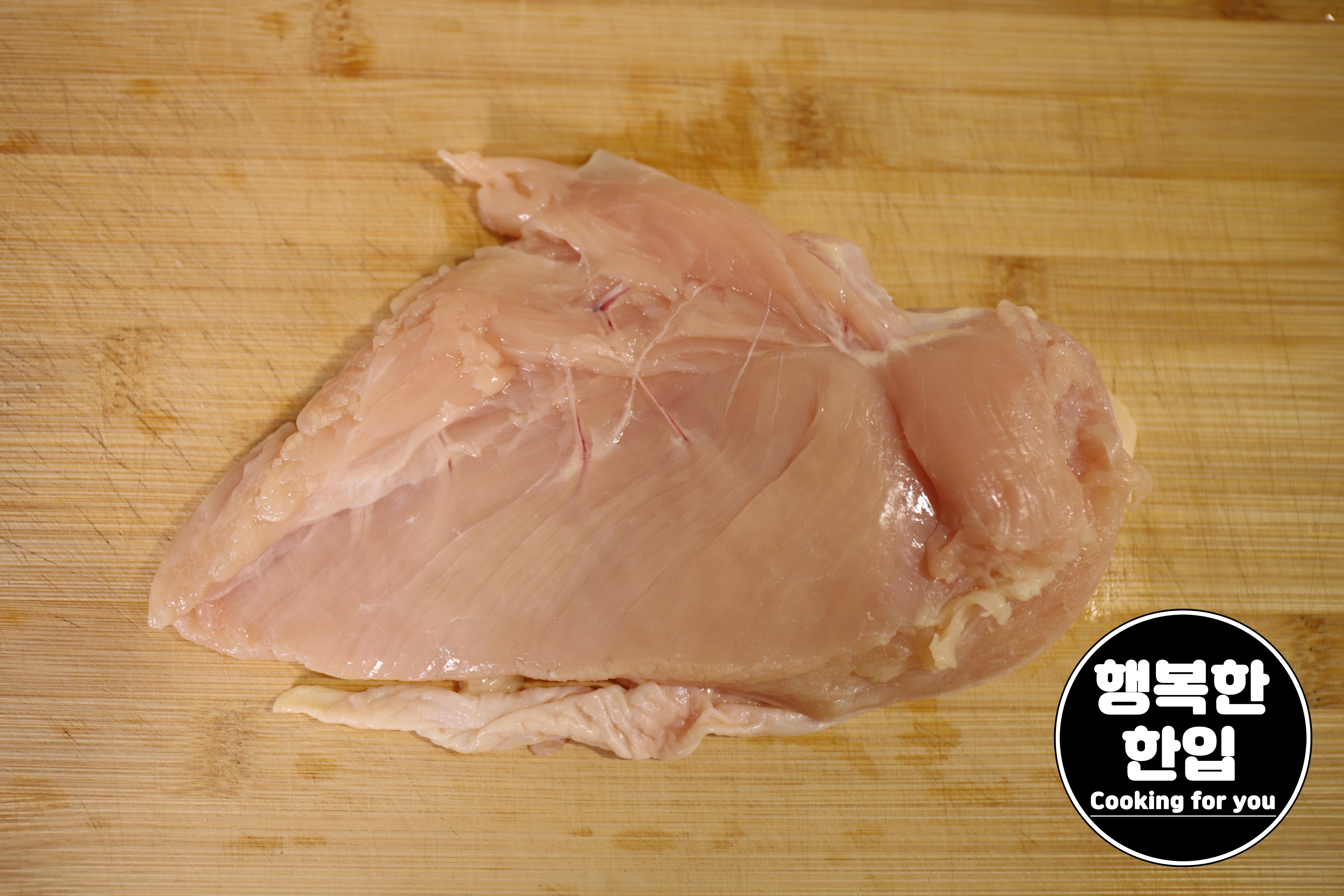 깨끗이 씻은 닭가슴살은 1.5cm~2cm정도 두께로 어슷하게 썰어줍니다.