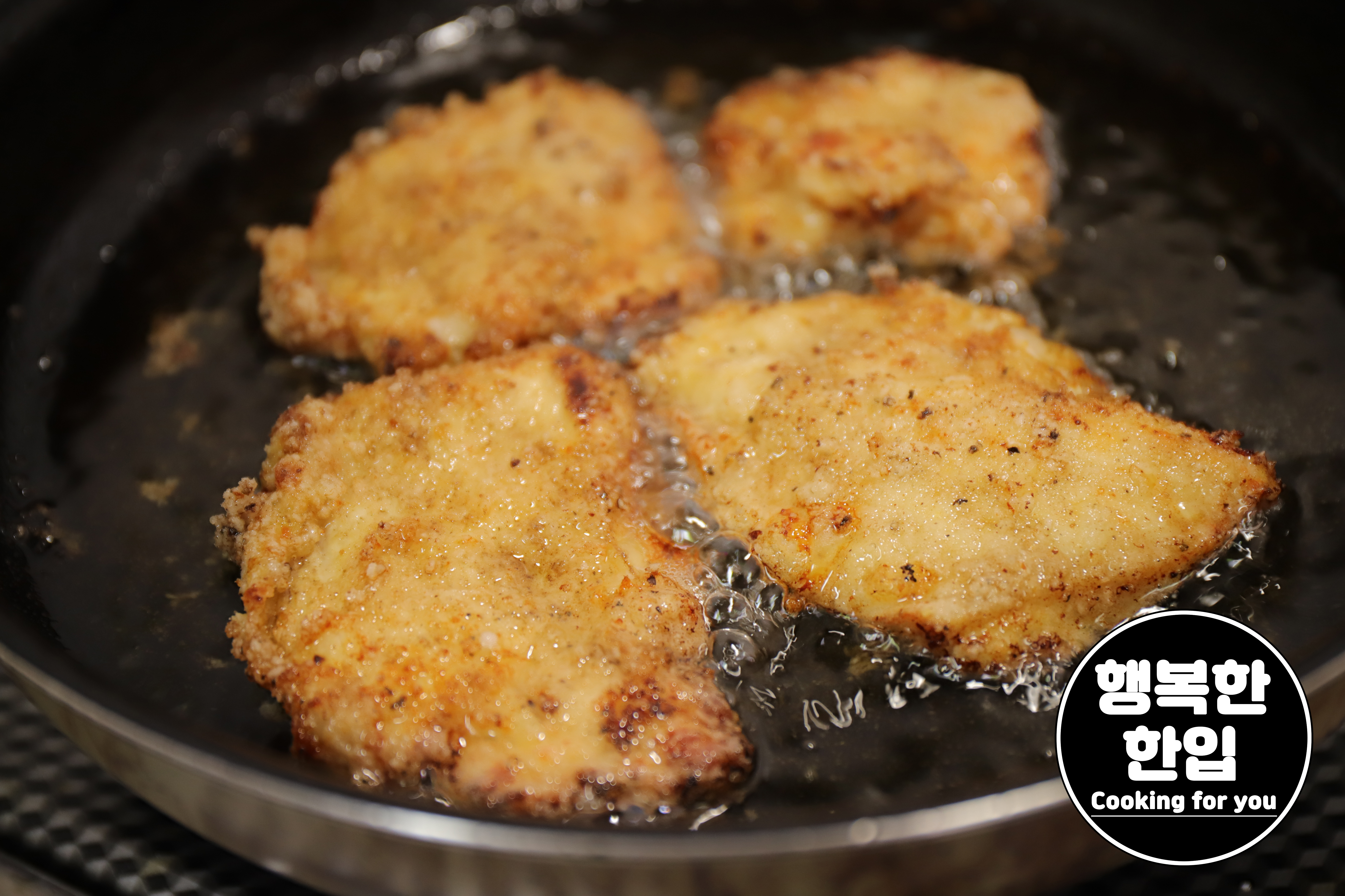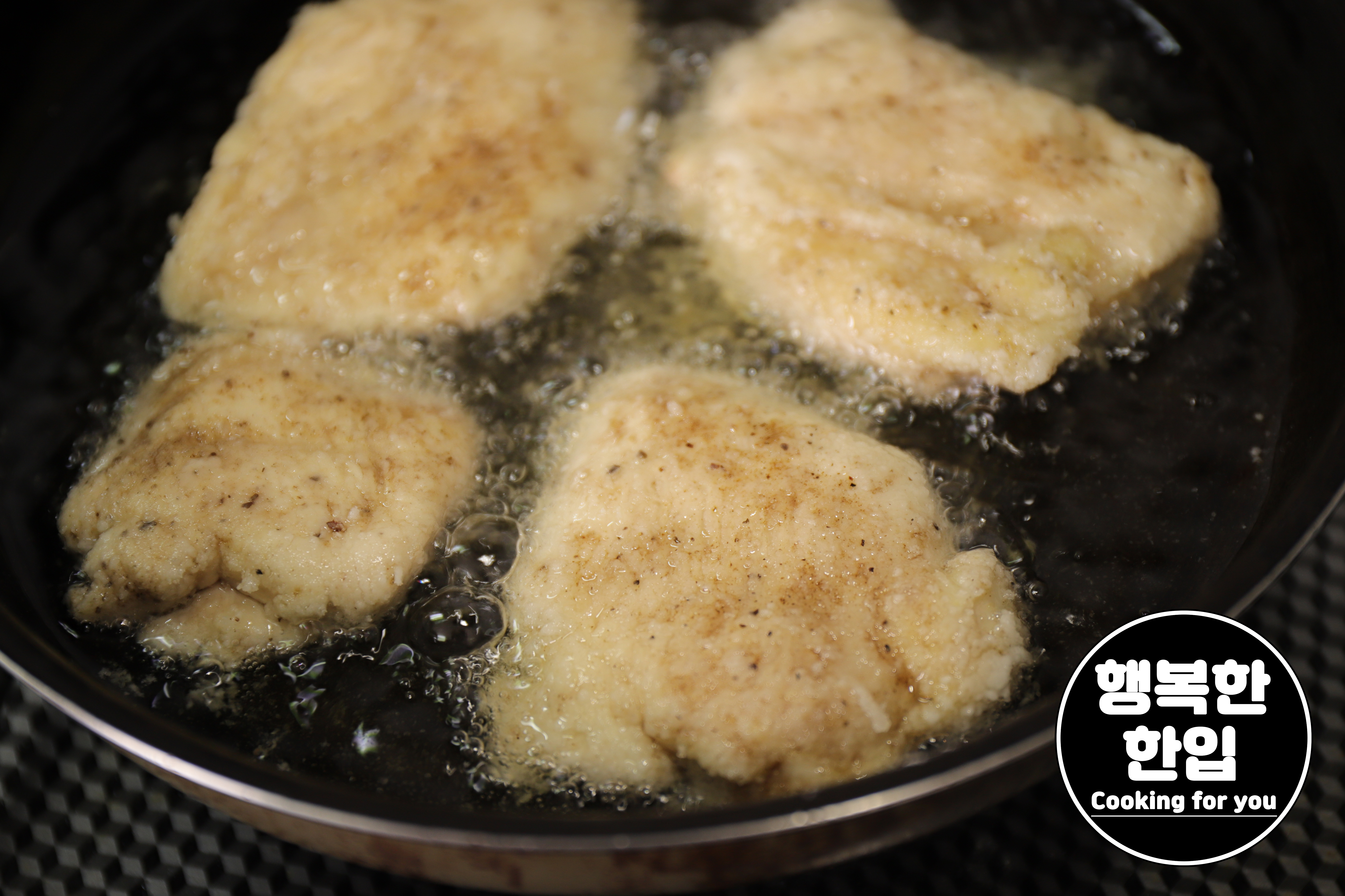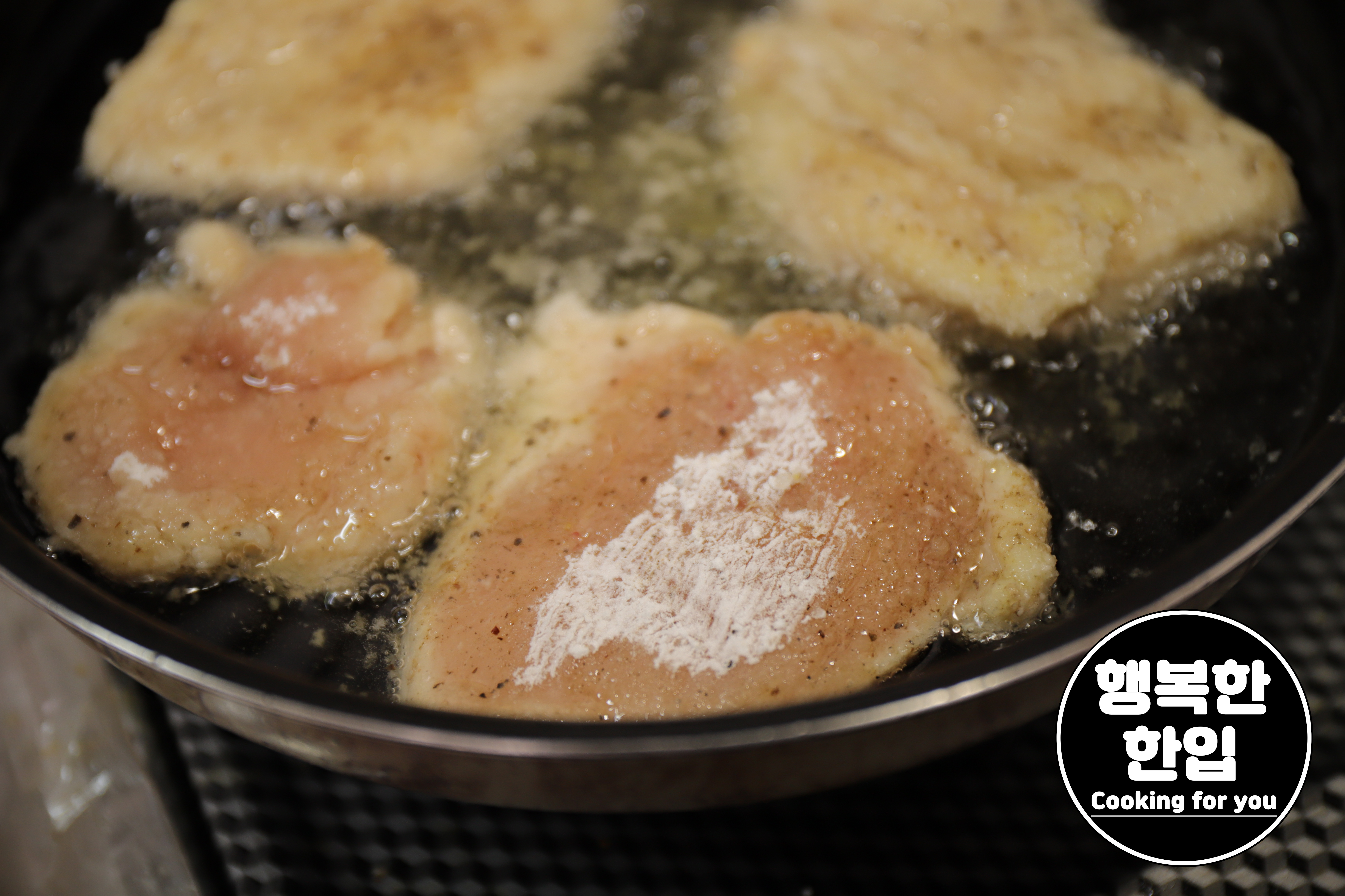 전분가루로 튀김옷을 입힌 닭가슴살을 프라이팬에 넣고 튀겨줍니다.