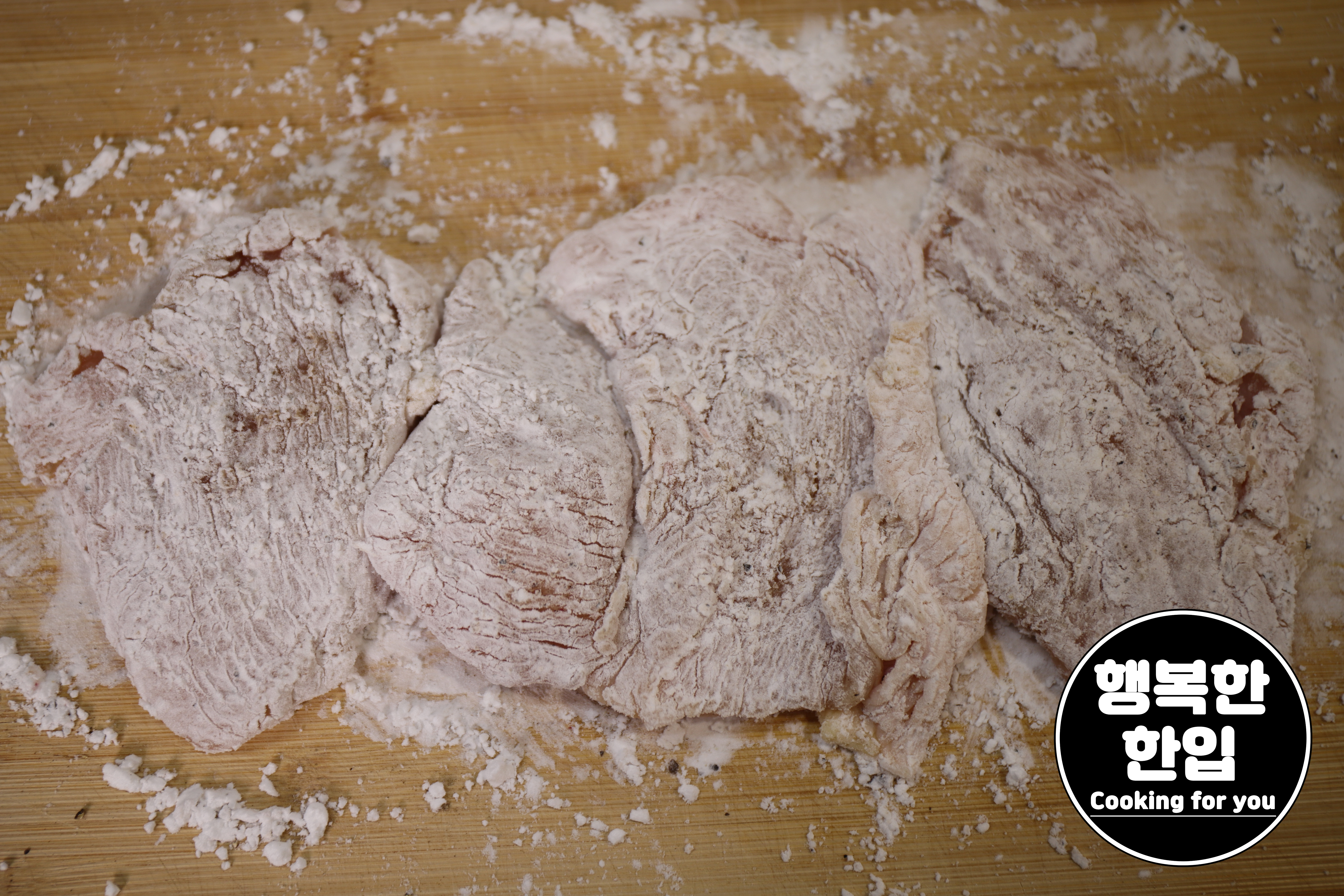 밑간을 마친 닭가슴살에 전분가루를 뿌려줍니다.