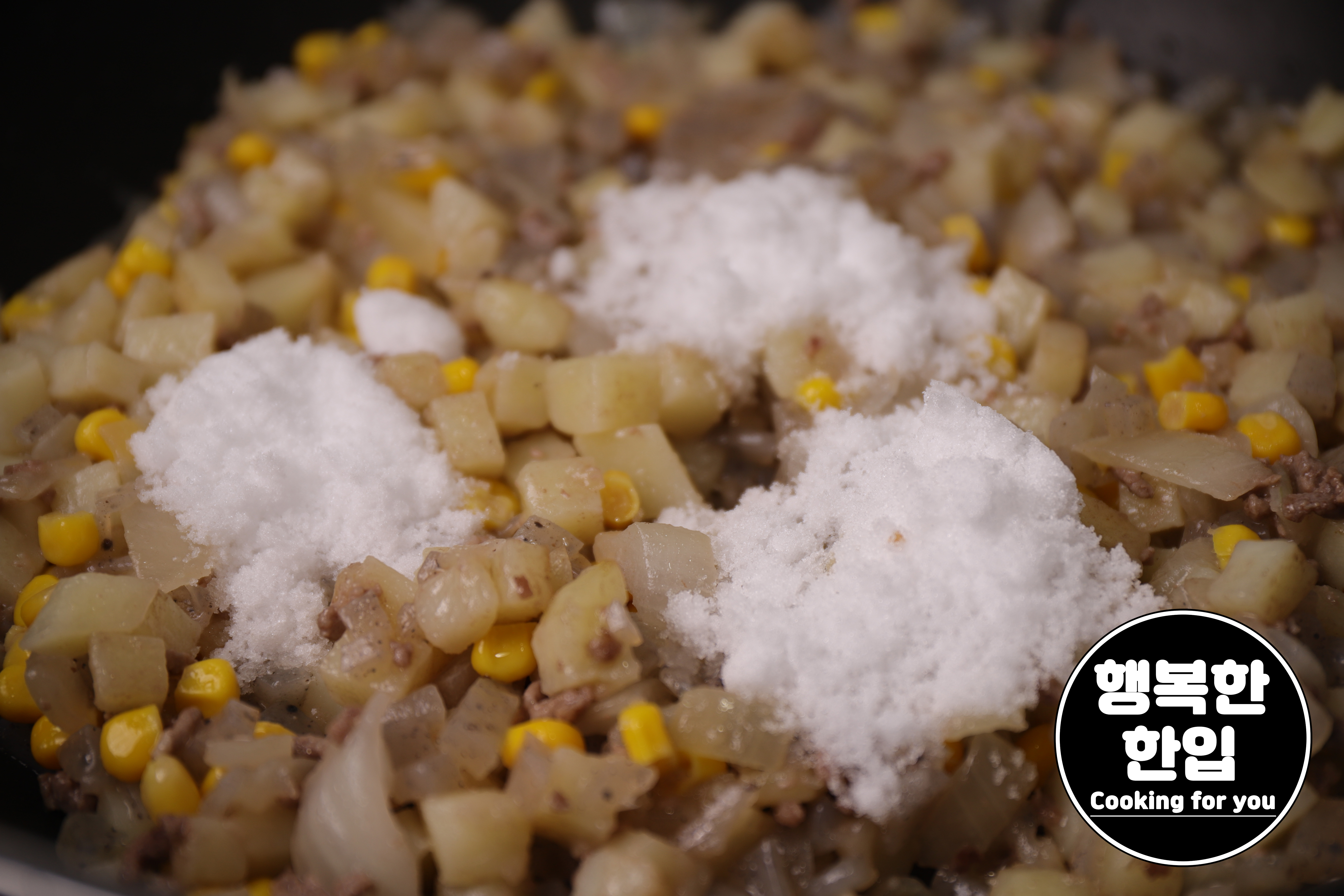 다진소고기가 거의 볶아 질 즈음 잘게 썰은 곤약 (200g ~ 250g)과 스위트콘 (100g ~ 120g)을 넣어서 가볍게 볶아주세요.