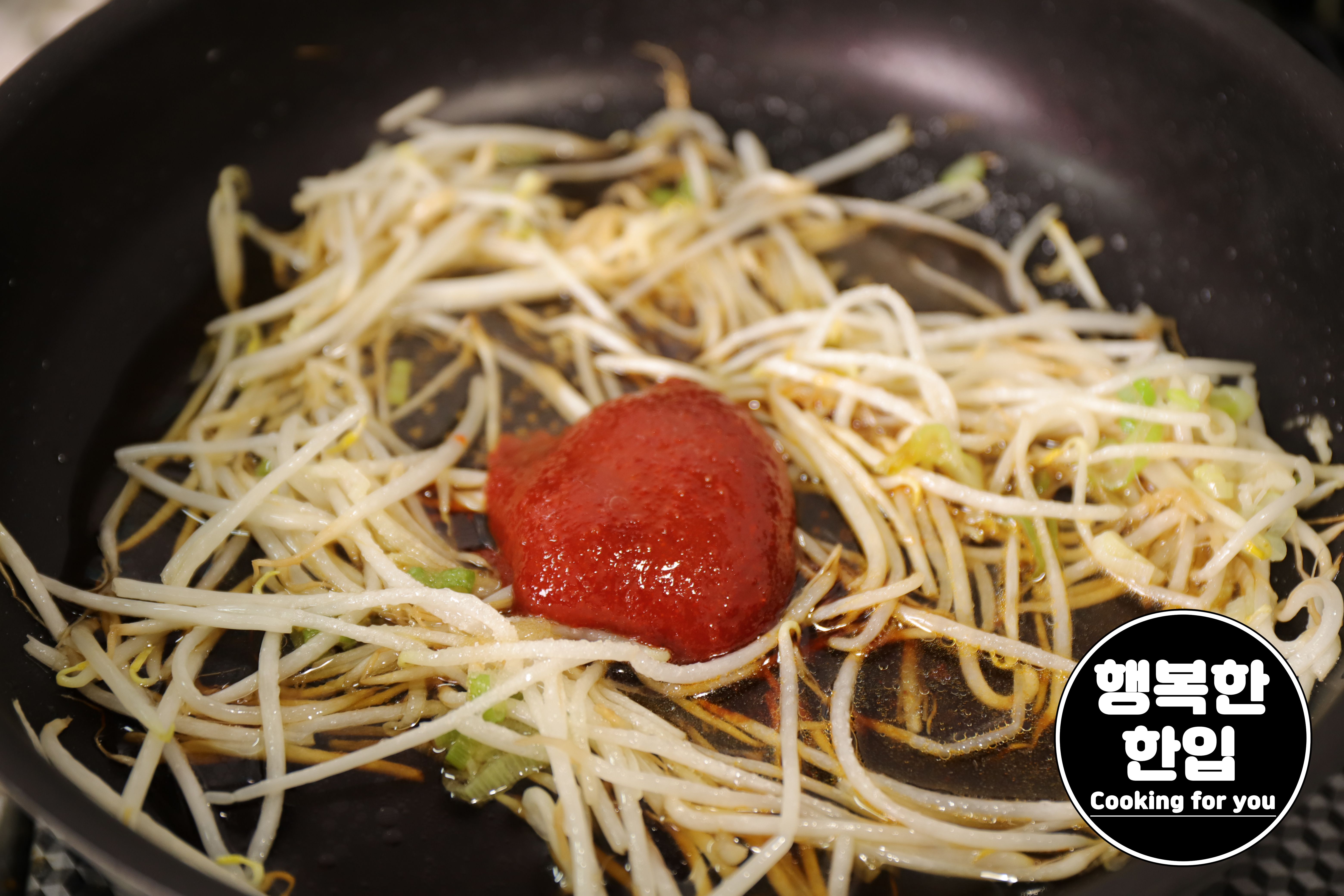콩나물이 가볍게 볶아지면 간장 1스푼, 굴소스 1스푼, 설탕 2스푼, 고추장 1스푼, 물 50ml을 넣고 약불에서 잘 섞어가며 졸여줍니다.