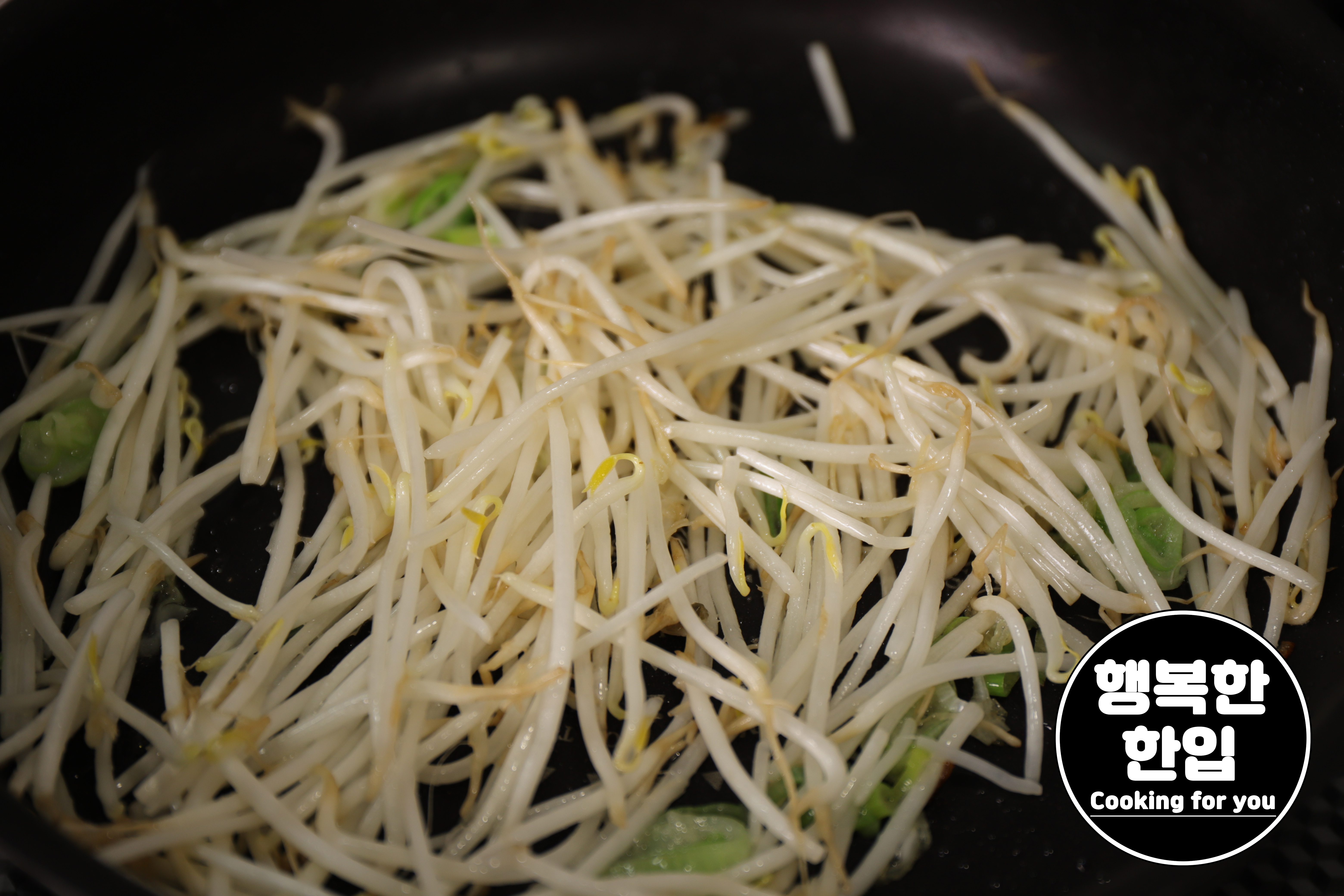 달구어진 프라이팬에 식용유를 적당히 두르고 대파 한줌으로 파기름을 만든 후 중간보다 조금 약한불로 콩나물을 볶아줍니다.