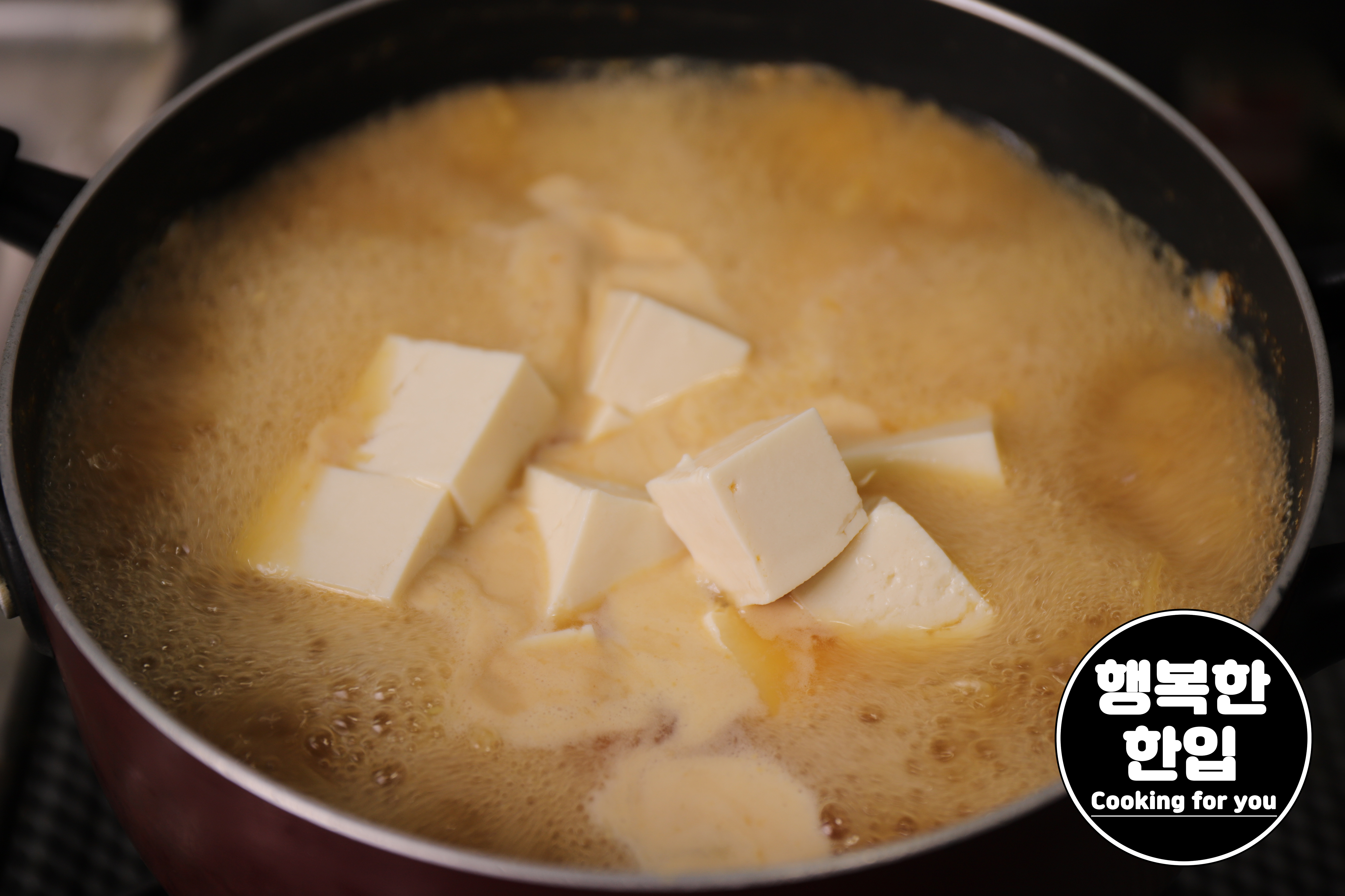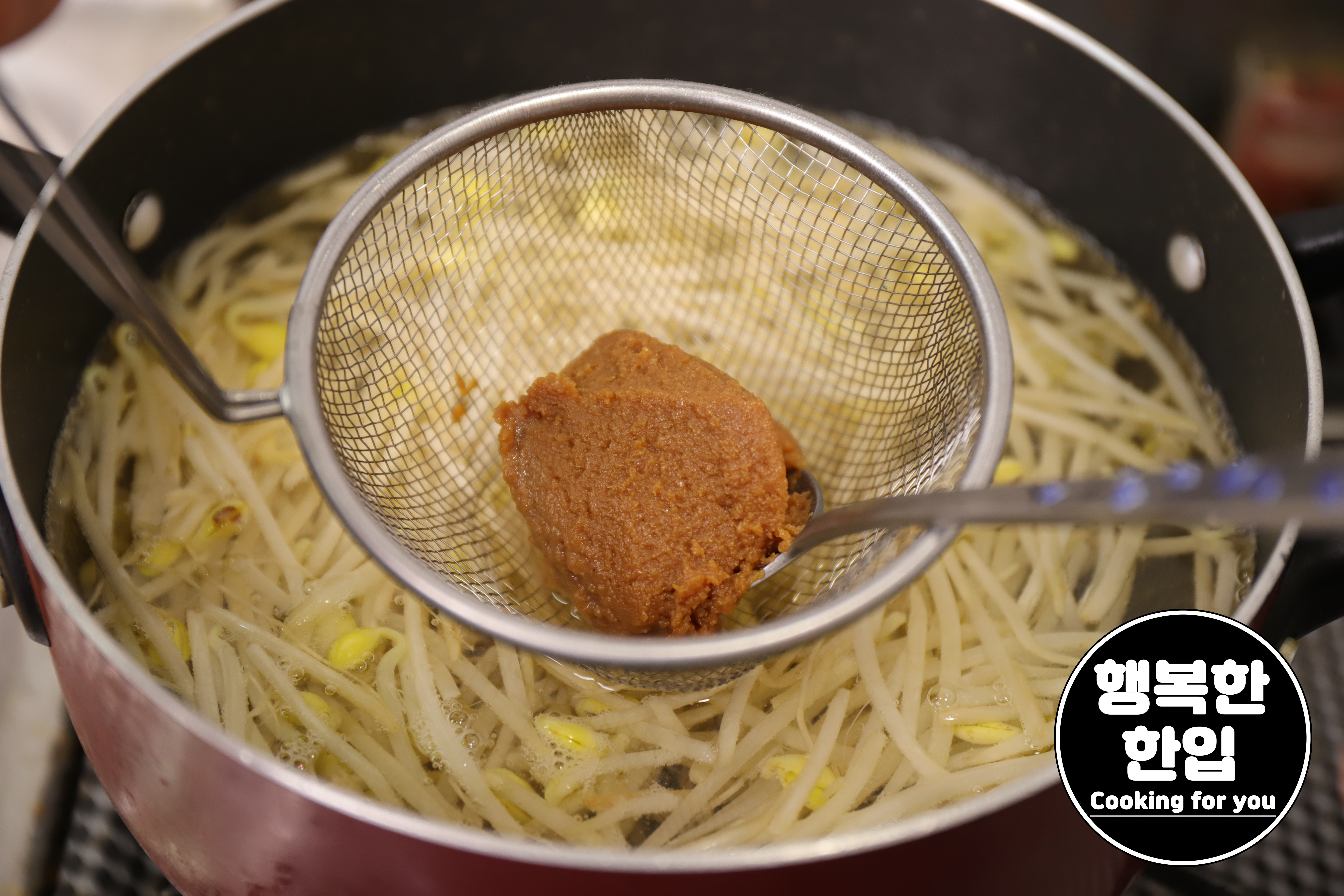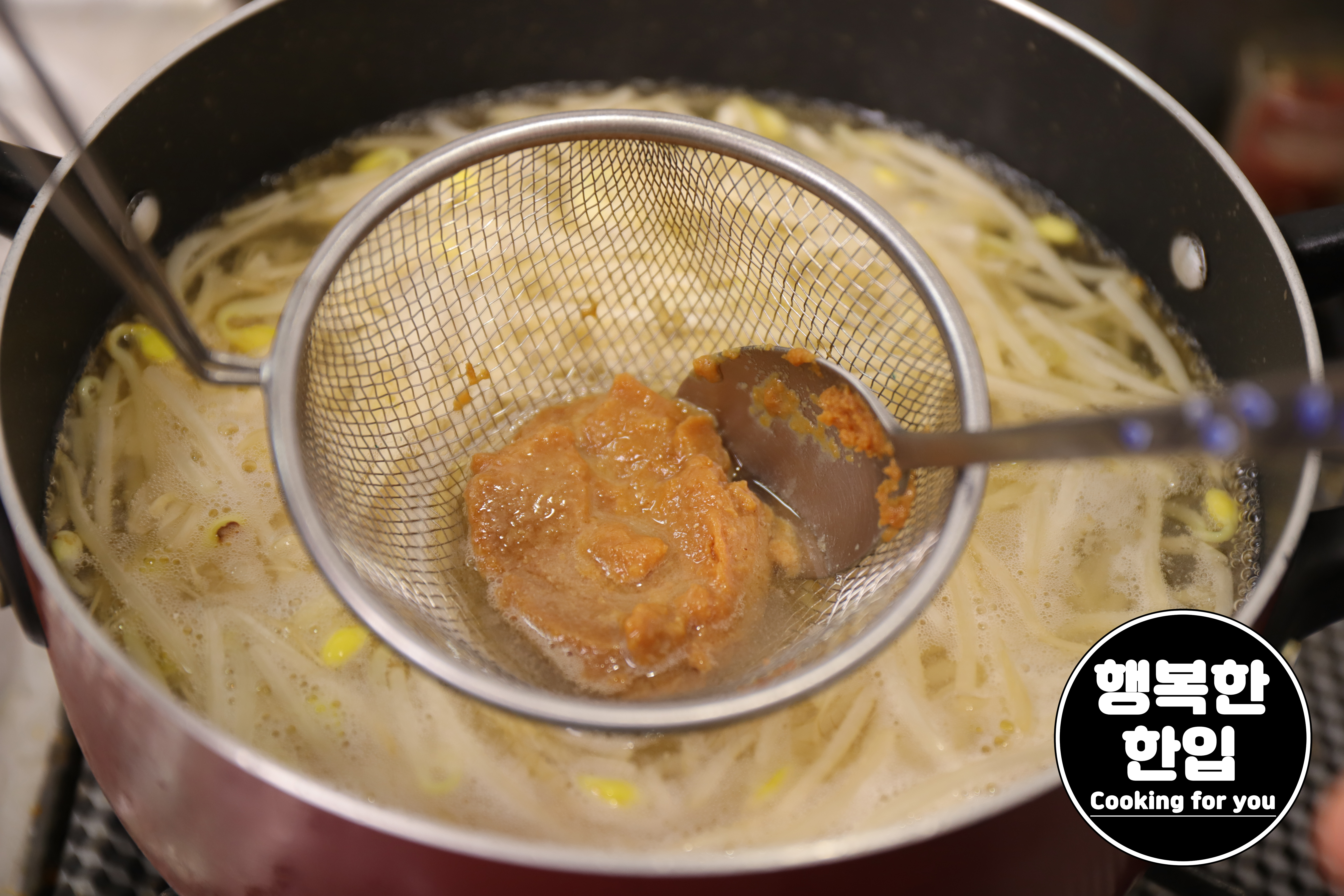 물이 끓어 오르면 미소된장을 크게 두스푼 풀어줍니다.