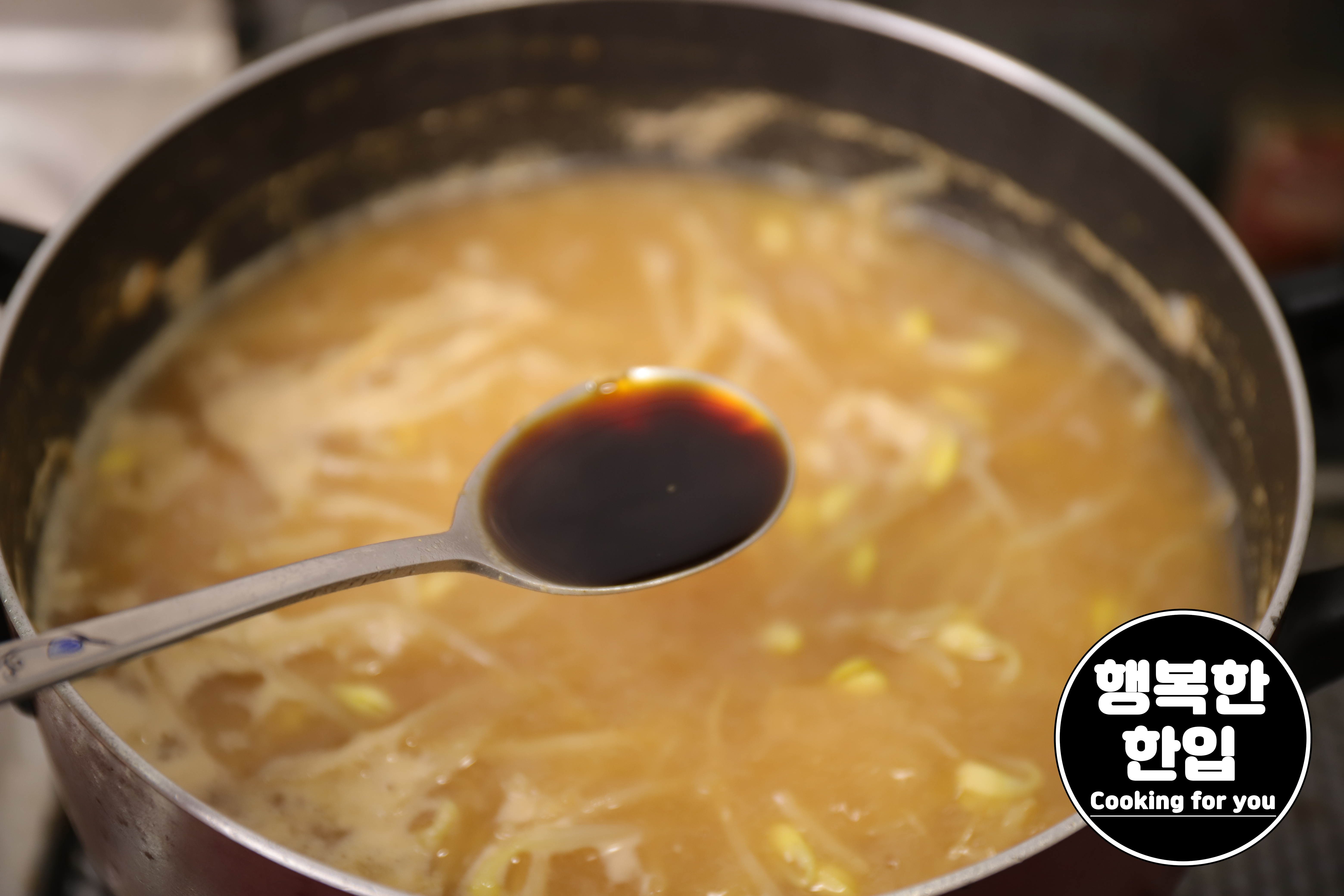 거품과 불순물이 어느정도 제거되면 간장 2스푼을 넣어줍니다.