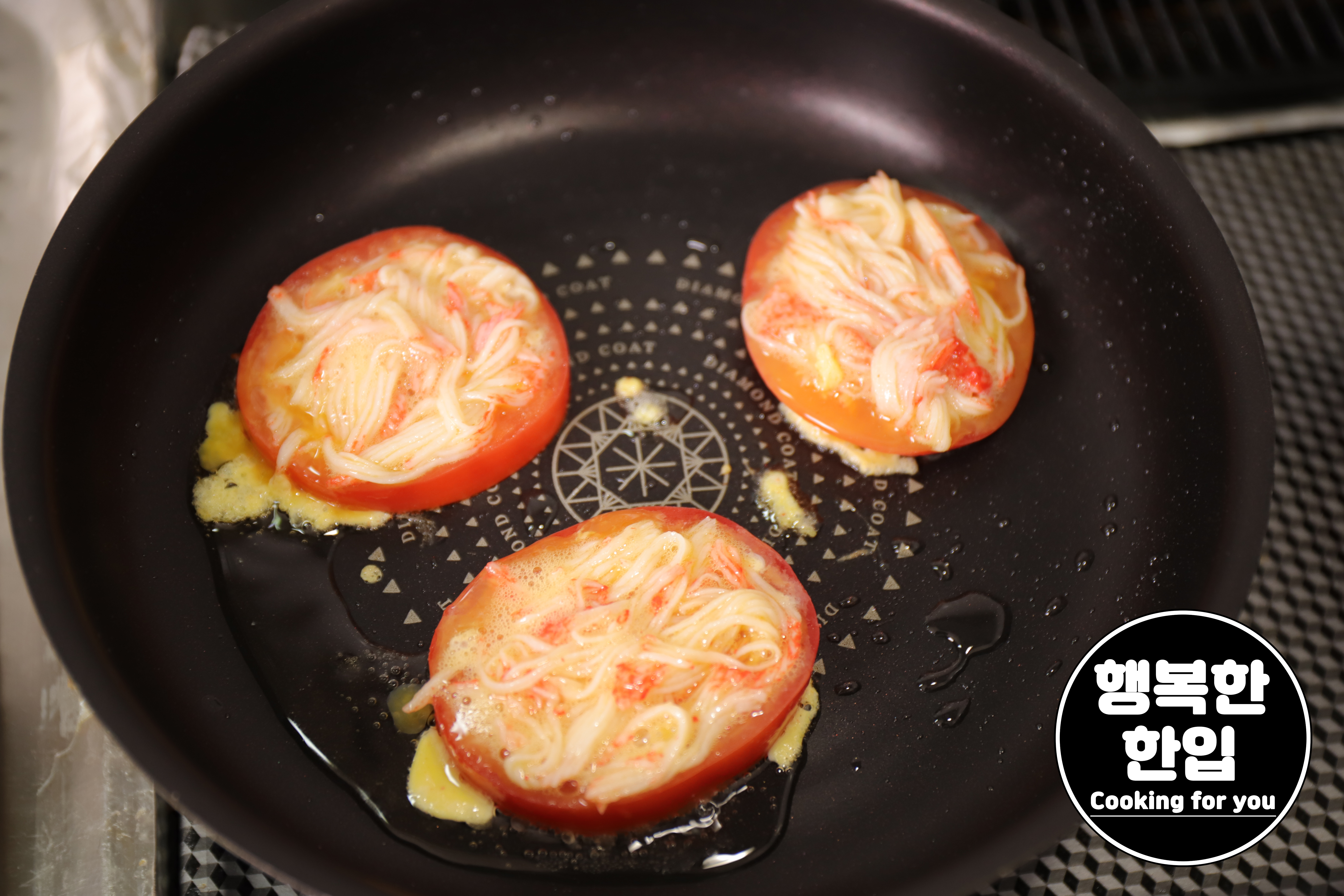 프라이팬에 식용유를 적당히 둘러주고 토마토를 올려주세요.