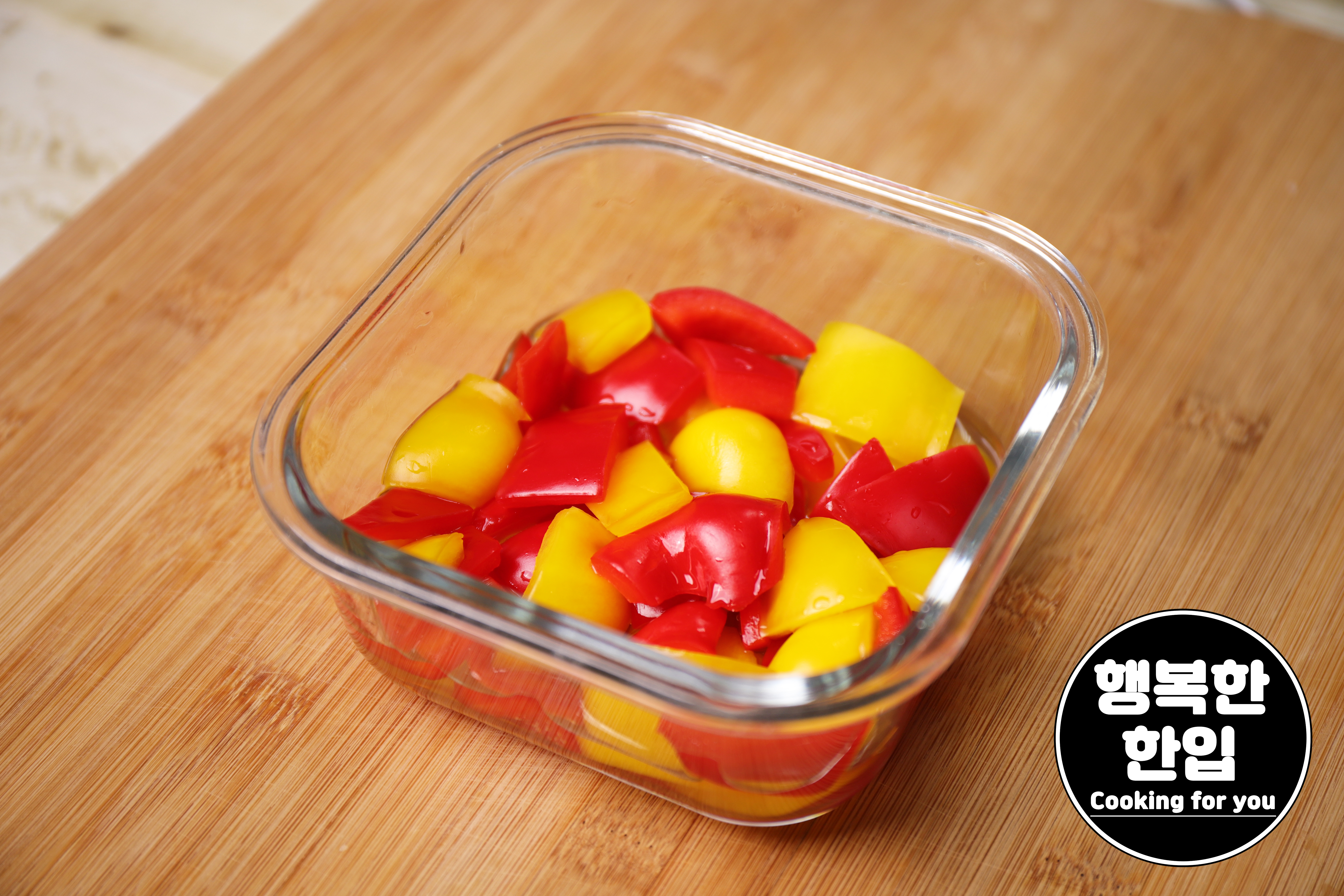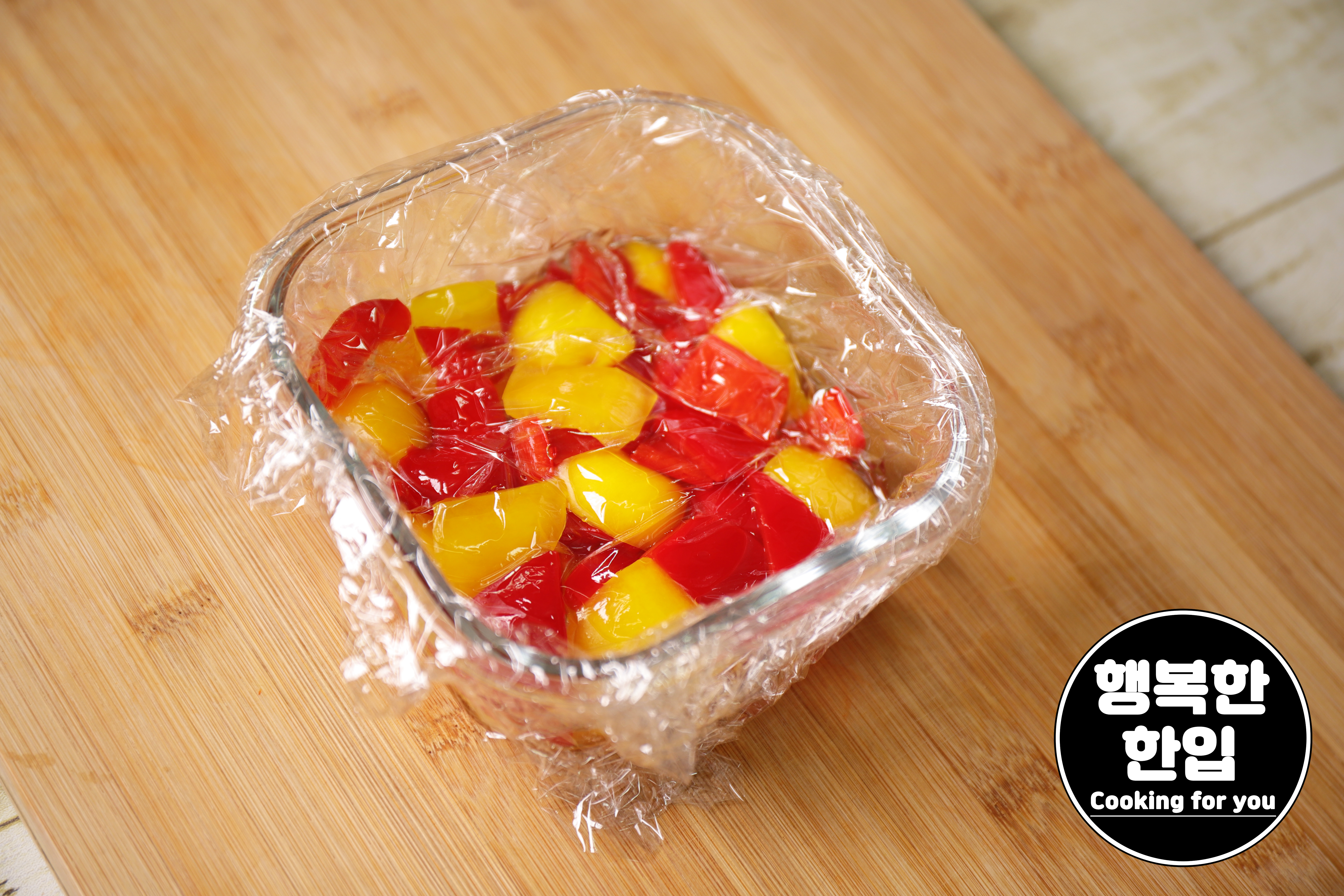 적당한 크기의 용기에 옮긴 후 파프리카에 새콤한 맛이 잘 스며들도록 위생랩으로 밀착 시켜주세요.