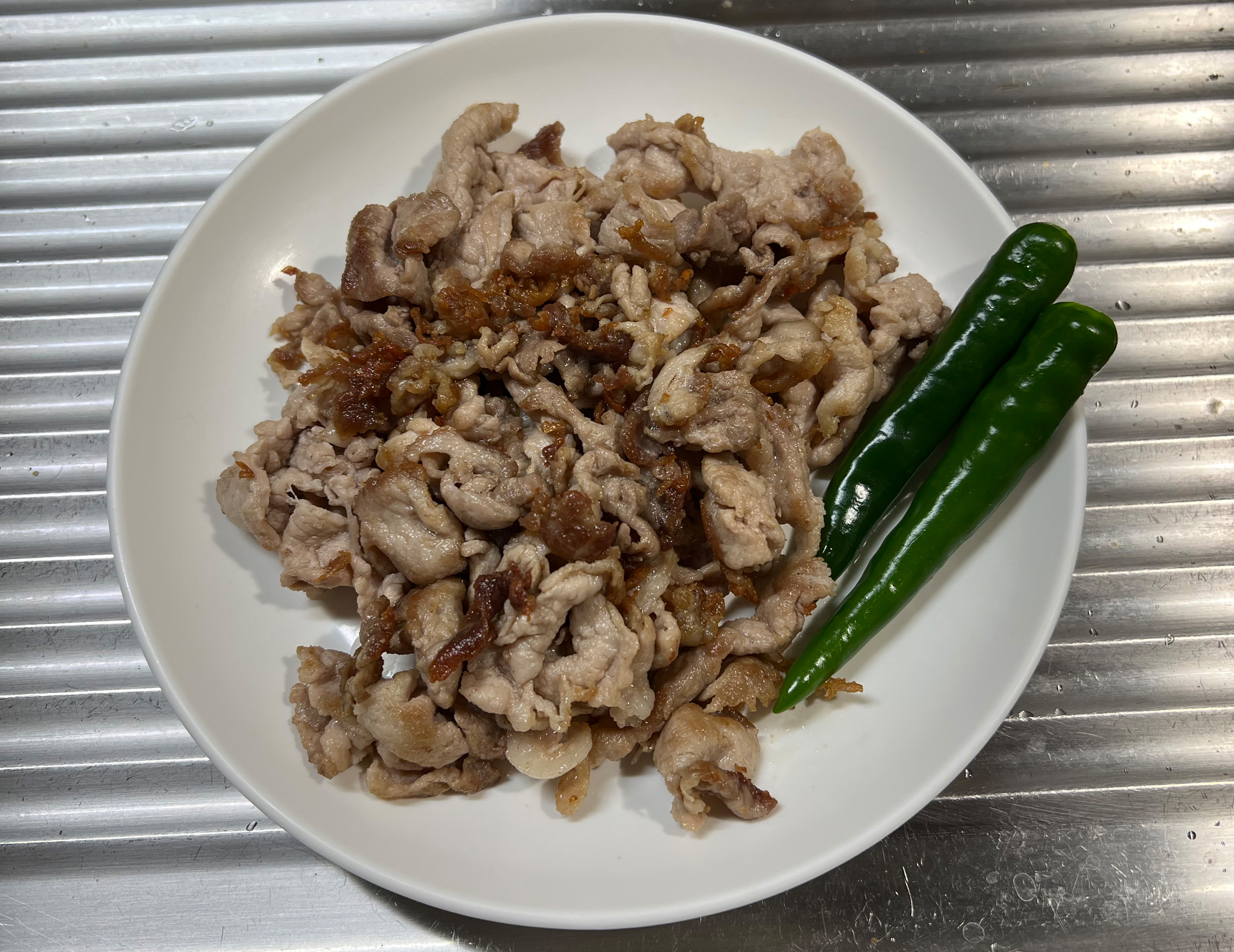 다 구워진 고기위에 고추 2개를 얹어 식탁으로 이동!
