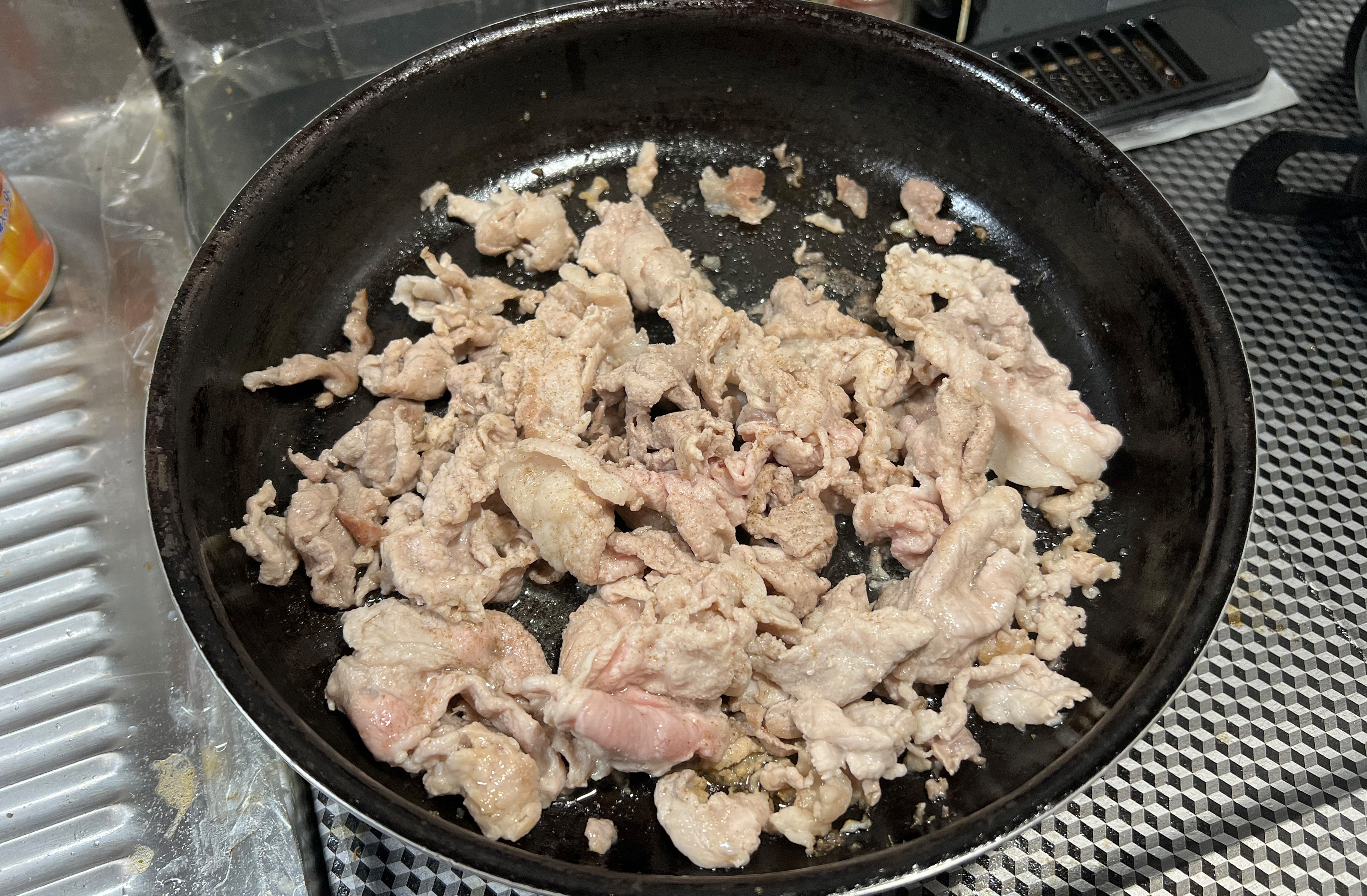 달구어진 프라이팬에 사온 고기를 넣고 굽기시작했다.